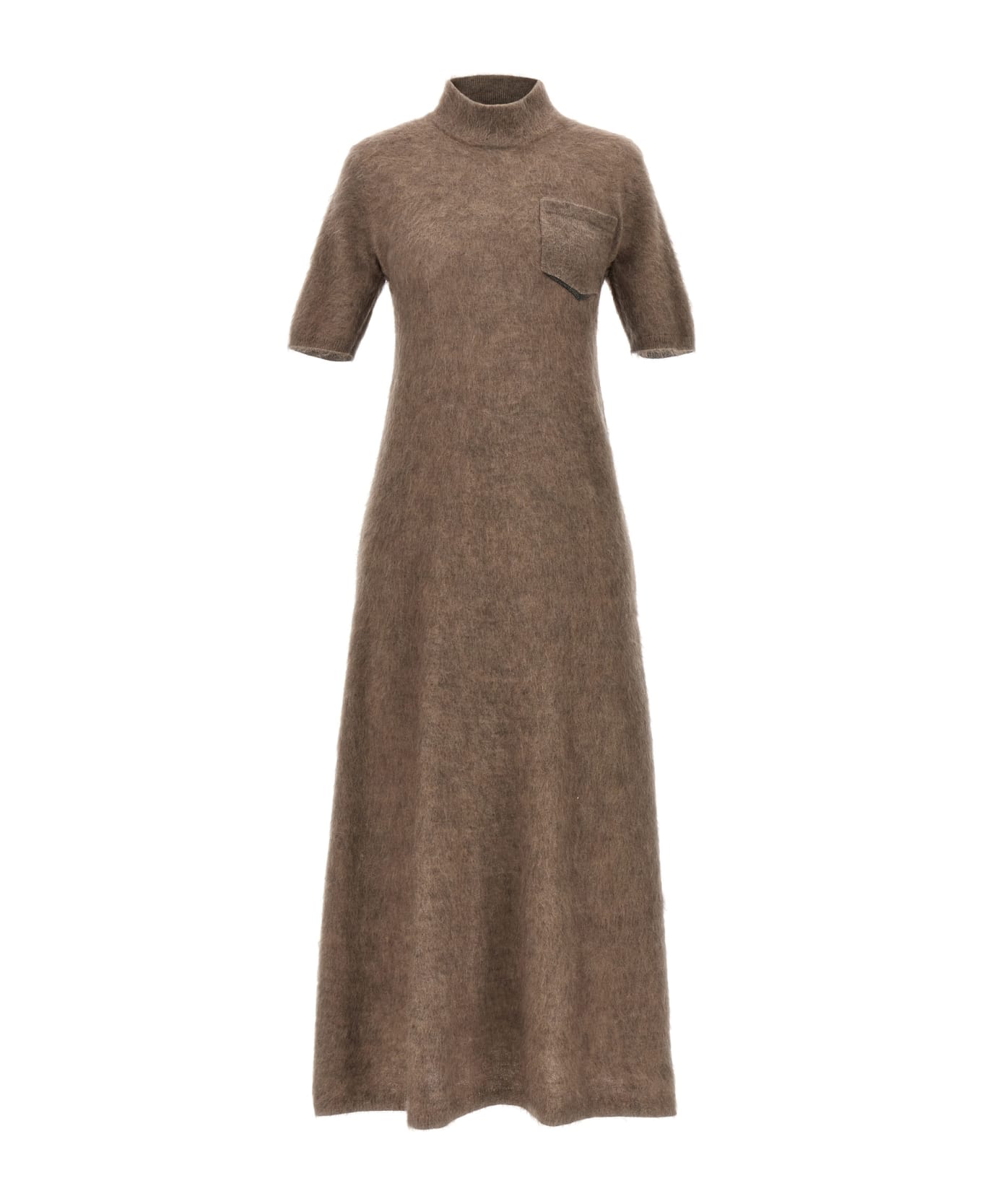 Mohair blend midi dress, front chest pocket with 'Monile' detail, high neck, short sleeves. Composition: 28% mohair 26% virgin wool 20% polyamide 13% cashmere 8% wool 5% silk