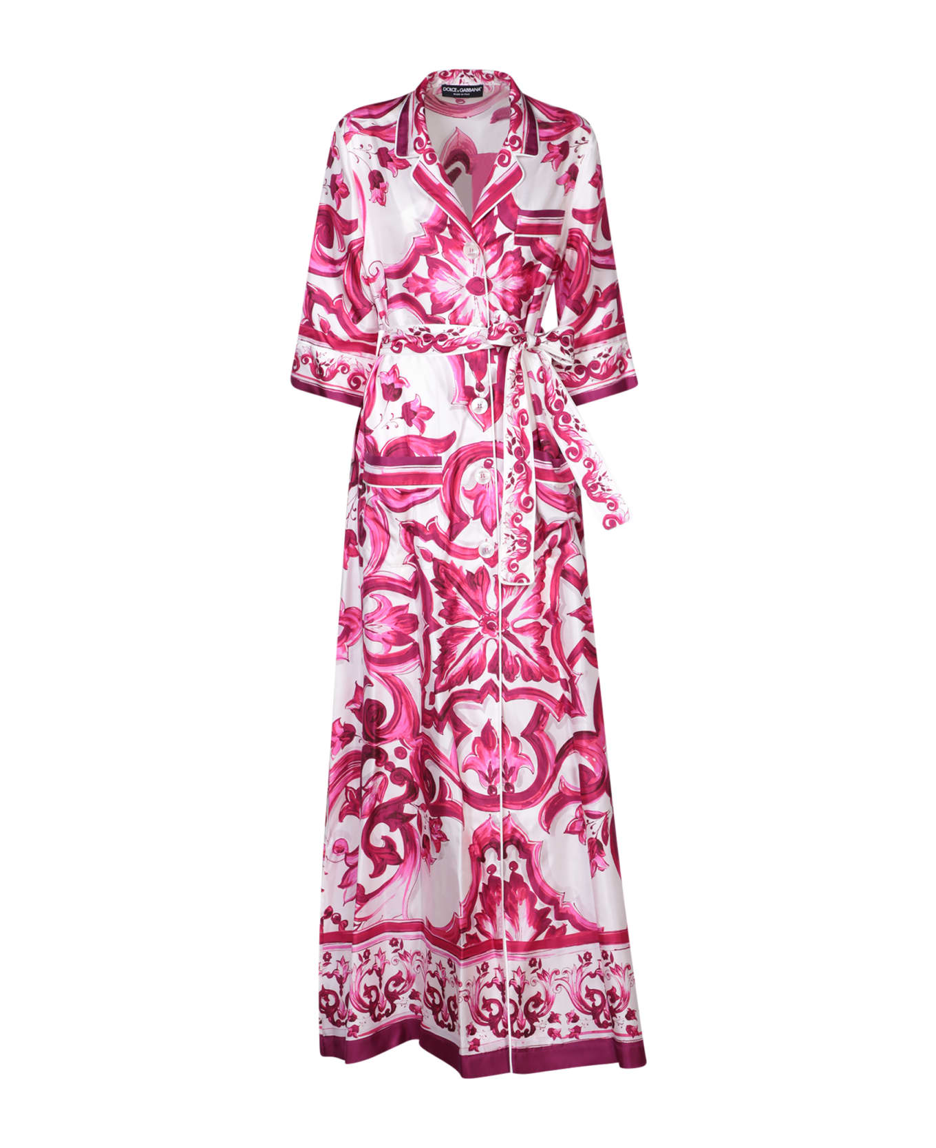 Classic collar. Front button fastening. Three quarter sleeves. Tie waistband. All-over majolica print. Two front patch pockets. Regular fit. Floor length. Straight hem. Color: fuxia/ white