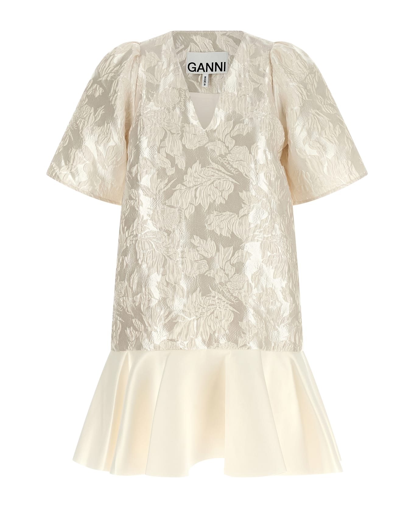 'Satin Cloque' jacquard mini dress, V-neck, slightly puff short sleeves, side zip closure, curled flounce on the hem. Composition: 90% polyester, 10% polyamide