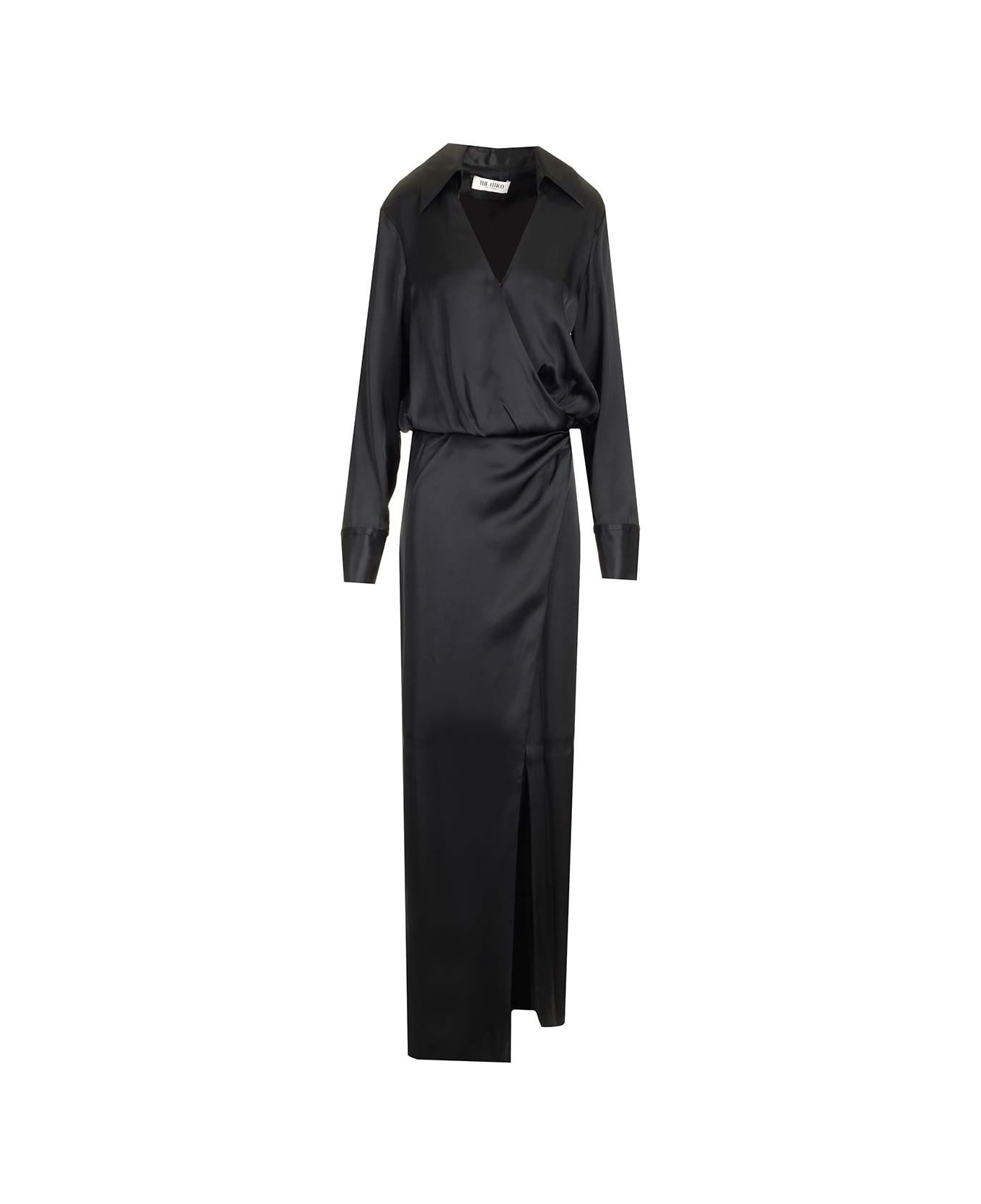 Midi dress from The Attico with black satin shirtdress design draped on the front, front slit on the left leg, deep V-neck.