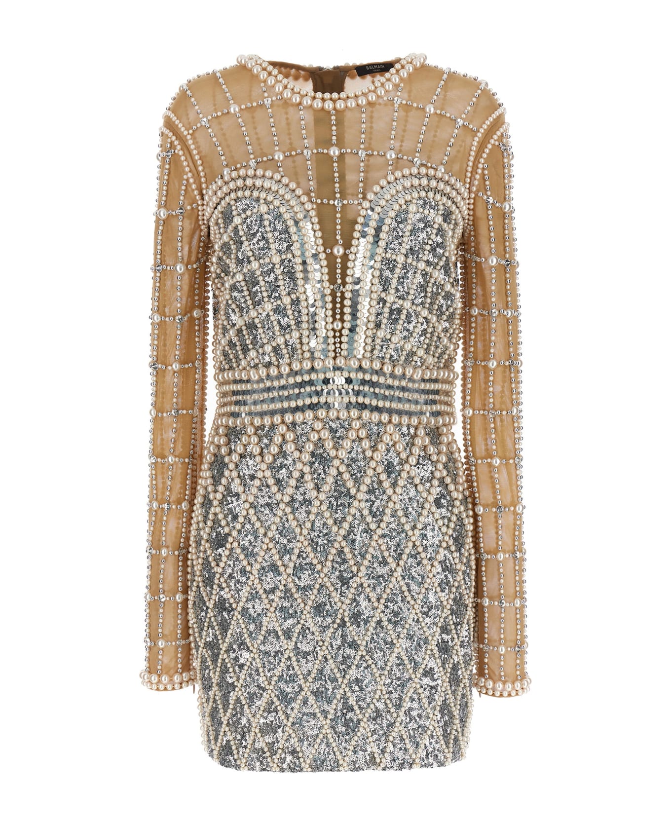 Tulle dress with beads and all-over sequins, crew neck, long sleeves, back zip closure. Composition: 97% polyamide 3% elastane