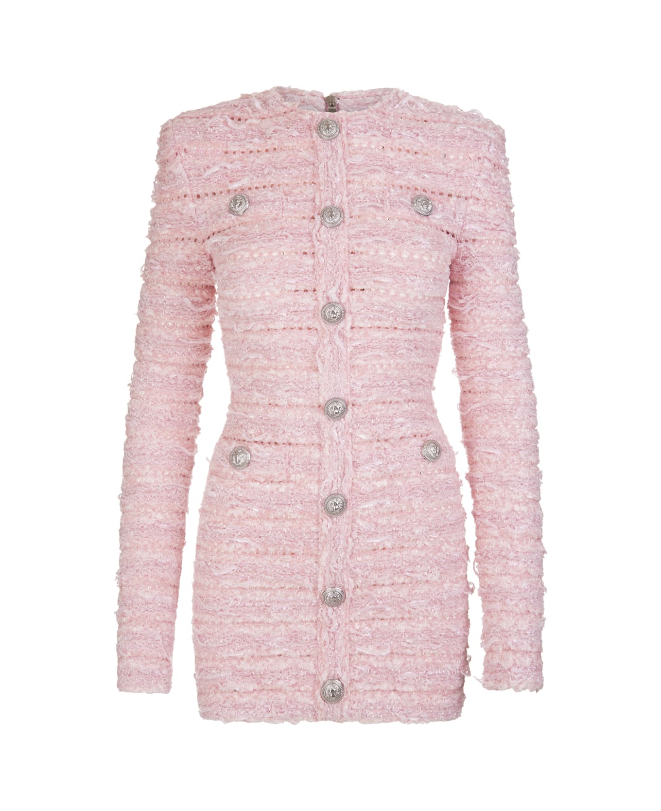 Balmain short dress crafted in light pink tweed and finished with silver embossed buttons on the front. Model featuring a tight fit, crew neck, long sleeves, faux pockets, three button cuffs and a silver zip fastening to the back.