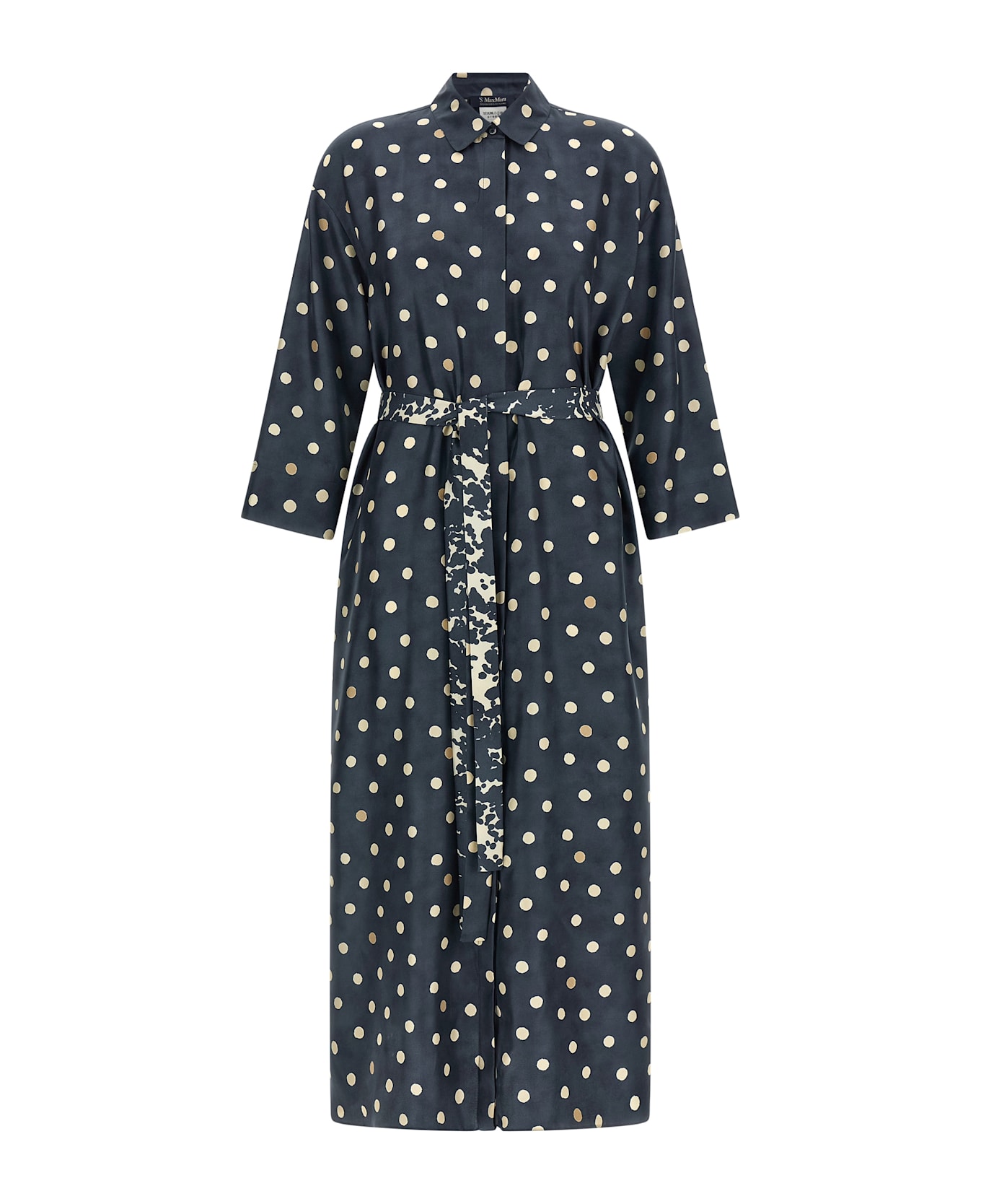 'SmmLeva' midi dress in pure silk twill with polka dot pattern, chemisier model, flared silhouette, hidden mother-of-pearl button closure on the front, 3/4 sleeves with cuffs and dropped shoulder, pockets, side slits, spur cut and back central crease, unlined, double removable belt: one in matching fabric, the other in contrast pattern.