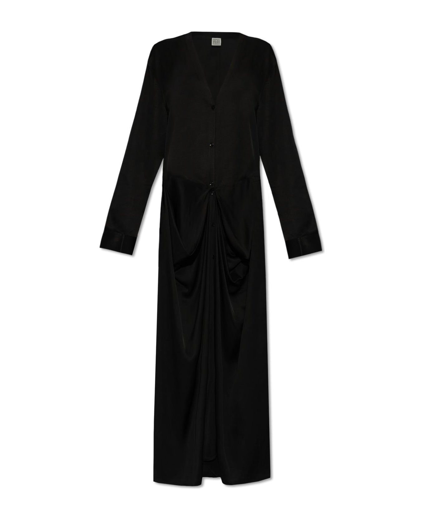 Black dress from Toteme. Rendered in satin, this style features a V-neckline, front button fastenings, drape detailing and long sleeves with button cuffs.