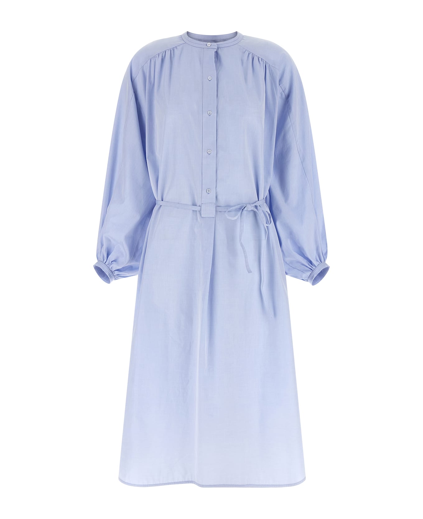'Vitti' midi dress in cool cotton poplin style, chemisier model, crew neck, front button closure, pockets, long raglan sleeves wide puff with cuffs, side slits, asymmetrical hem, removable belt.