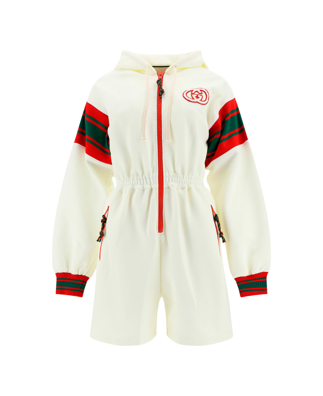 Hooded jumpsuit by gucci, hood with adjustable drawstring, contrasting front zipper closure, two-tone printed bands on sleeves, embossed patch with iconic brand logo applied to front, elasticated waistband gathers, zippered welt pockets applied to side panels of shorts, elasticated cuffs with iconic brand colors.