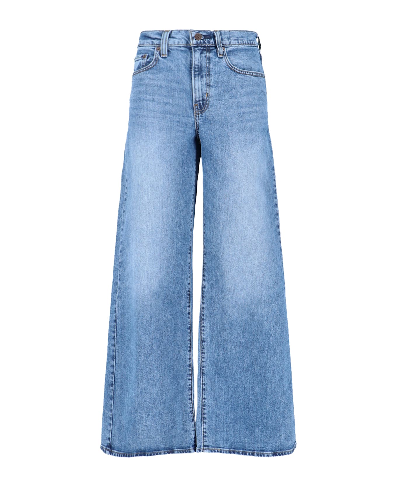 Wide Levi's Strauss 728 jeans in light blue denim with distressed wash, high waist, belt loops, button and zip closure, five-pocket design, back logo patch, and wide leg. Composition: 98% Cotton, 2% Elastane