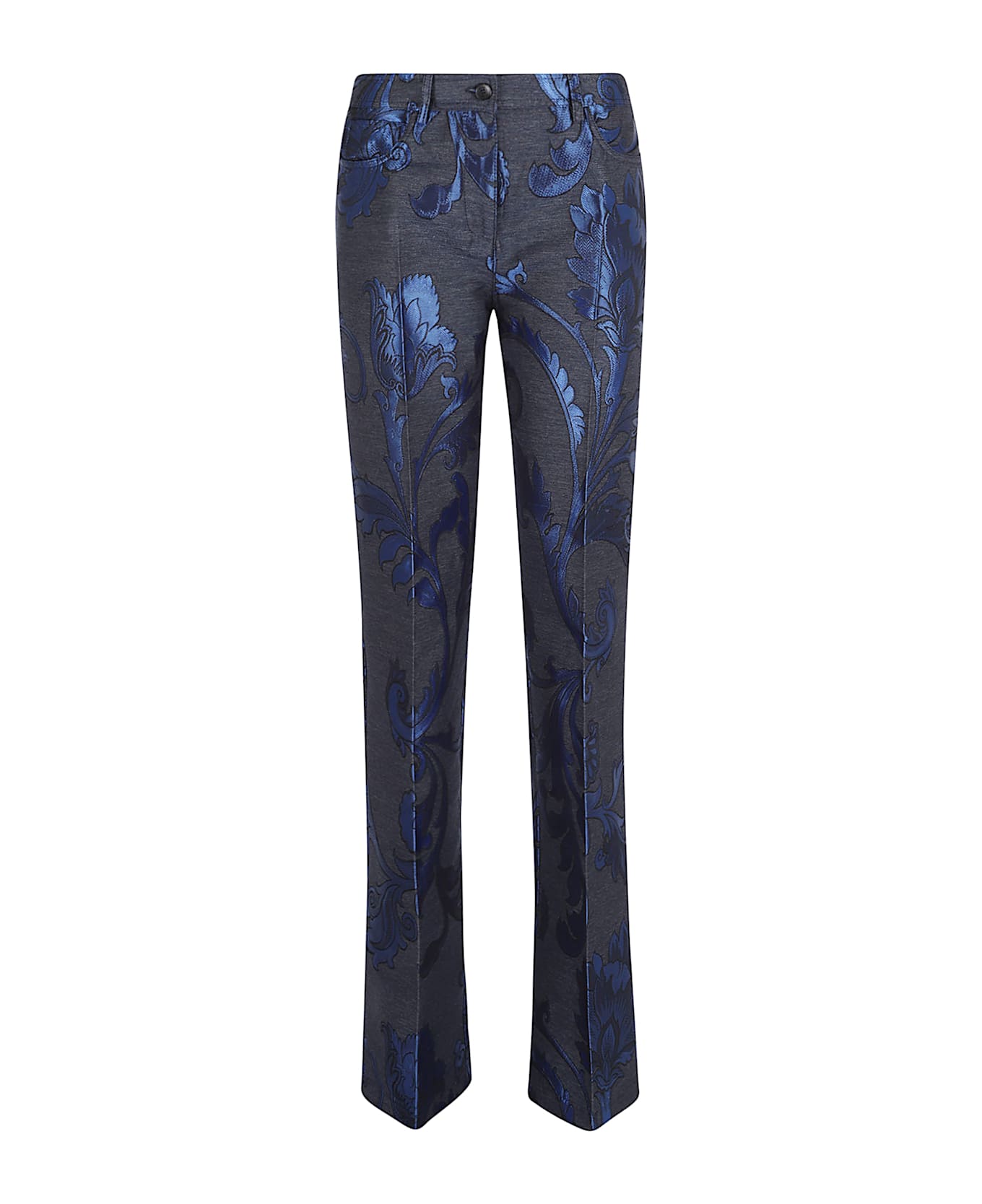 Cotton denim trousers by ETRO. Mid-rise; zip and button closure; belt loops; five pockets; slim fit. Featuring a pressed crease and a flared fit.