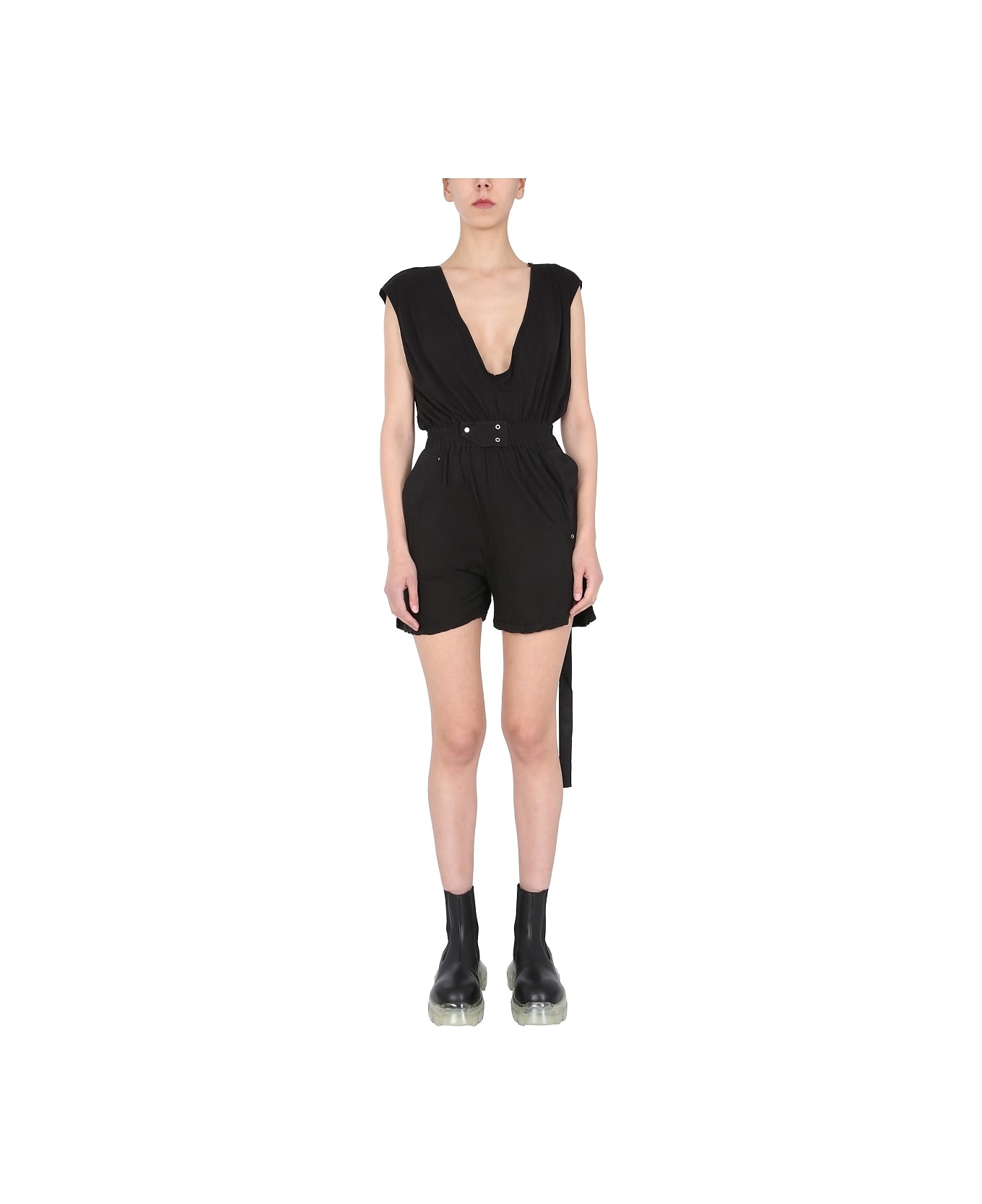 Buttons on the shoulders closure sleeveless deep v neckline drapes elastic waist with snap details and front eyelet side pockets with rivet and eyelet details drkshdw logo patch drkshdw hanging tape made in italy model is 184 cm tall and wears size. Lining: Unlined; Care instructions: Hand Wash