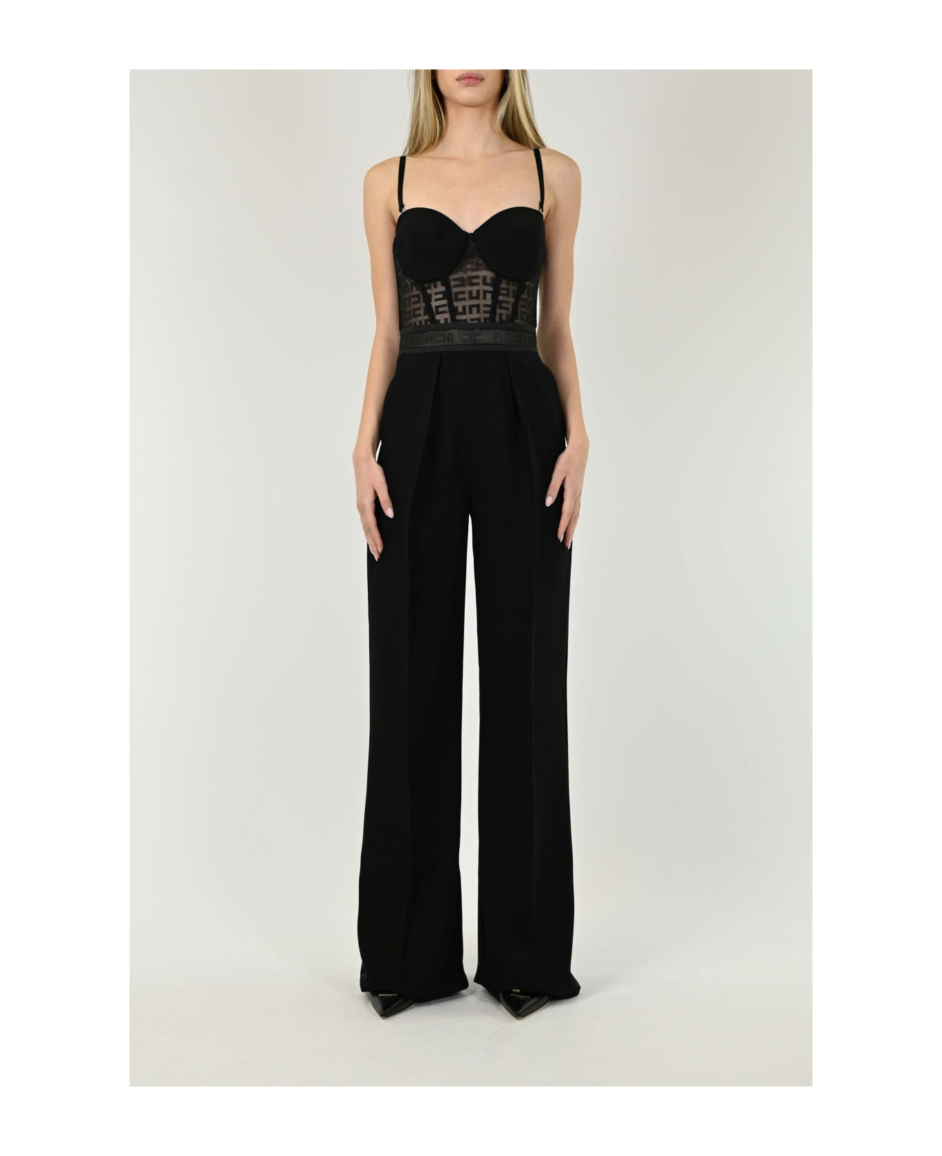 jumpsuit with logo jacquard lace bustier top and men's straight trousers with pleats on the front. jumpsuit bustier top strapless logo jacquard lace elastic mesh band straight men's trousers pleats article composition 100% polyester