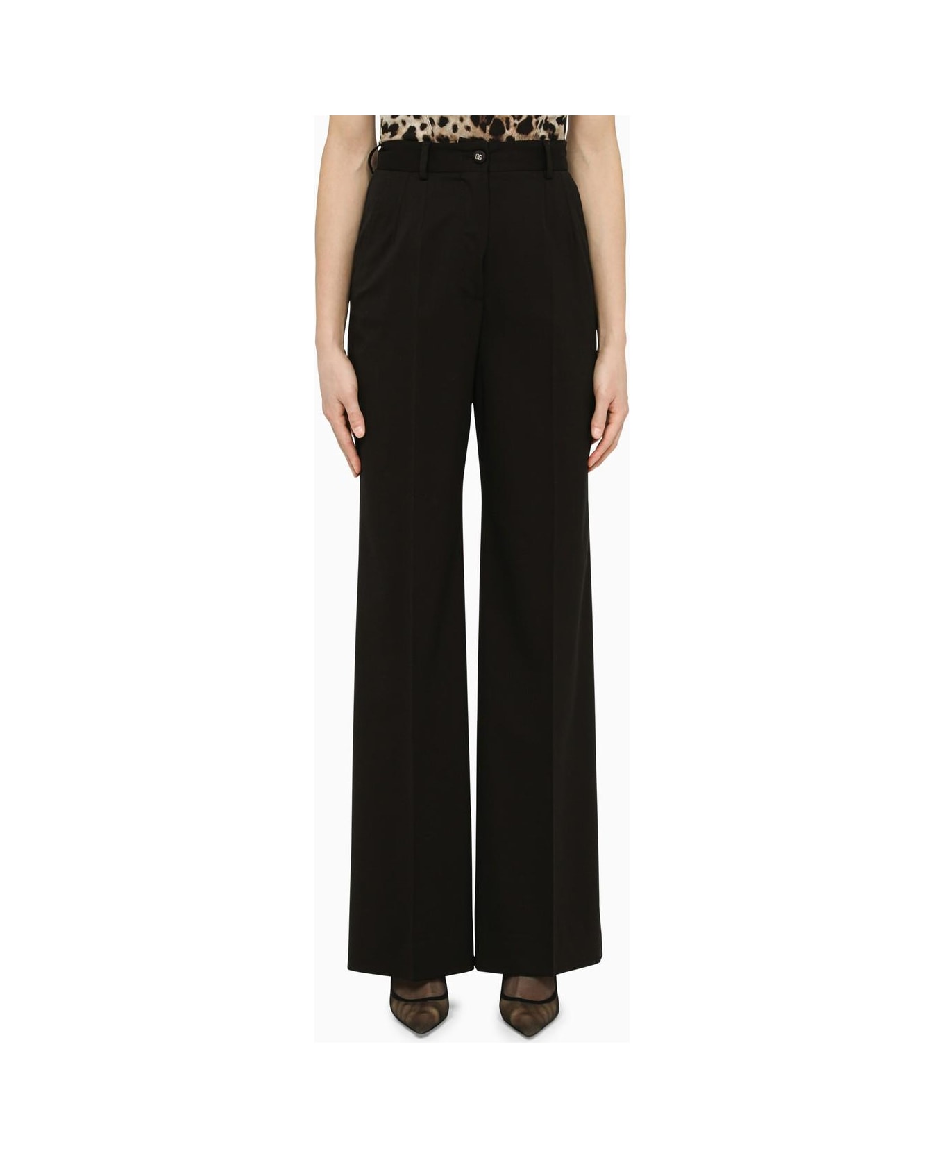 Black stretch wool high-waisted trousers from Dolce & Gabbana featuring belt loops, a logo button, two welt pockets on the back and two bellows pockets on the sides. Composition: 97% Virgin wool - 3% Elastane