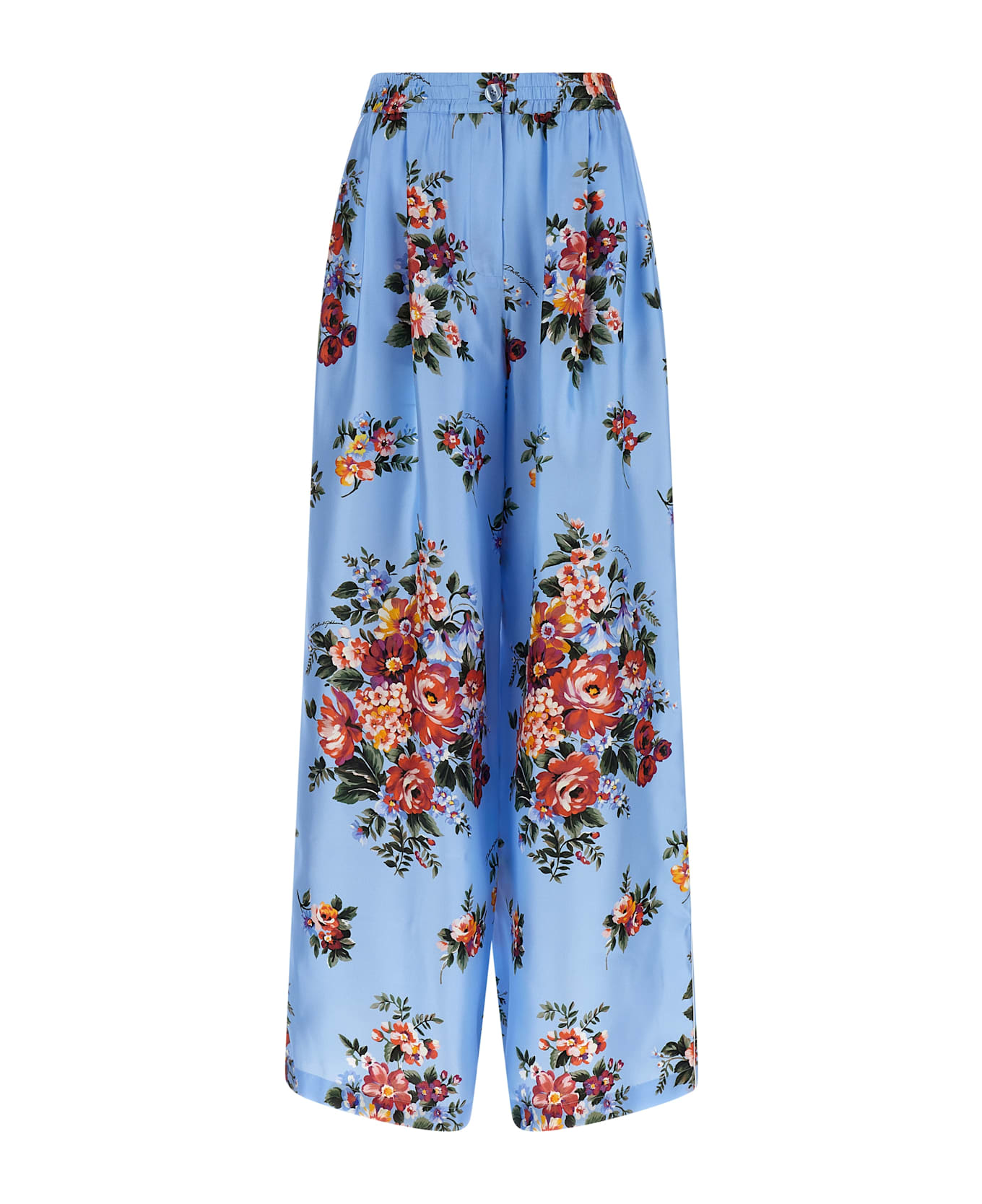 All-over 'Mazzo di Fiori' print silk twill trousers, contrast piping, high waist 'Dolce', wide and straight leg, elastic waistband, front mother-of-pearl zip and button closure, front American pockets, back welt pockets. The differences in print placement you might find on this product is a characteristic of Dolce&Gabbana's Handmade products. A peculiarity that makes each garment or accessory unique and exclusive.