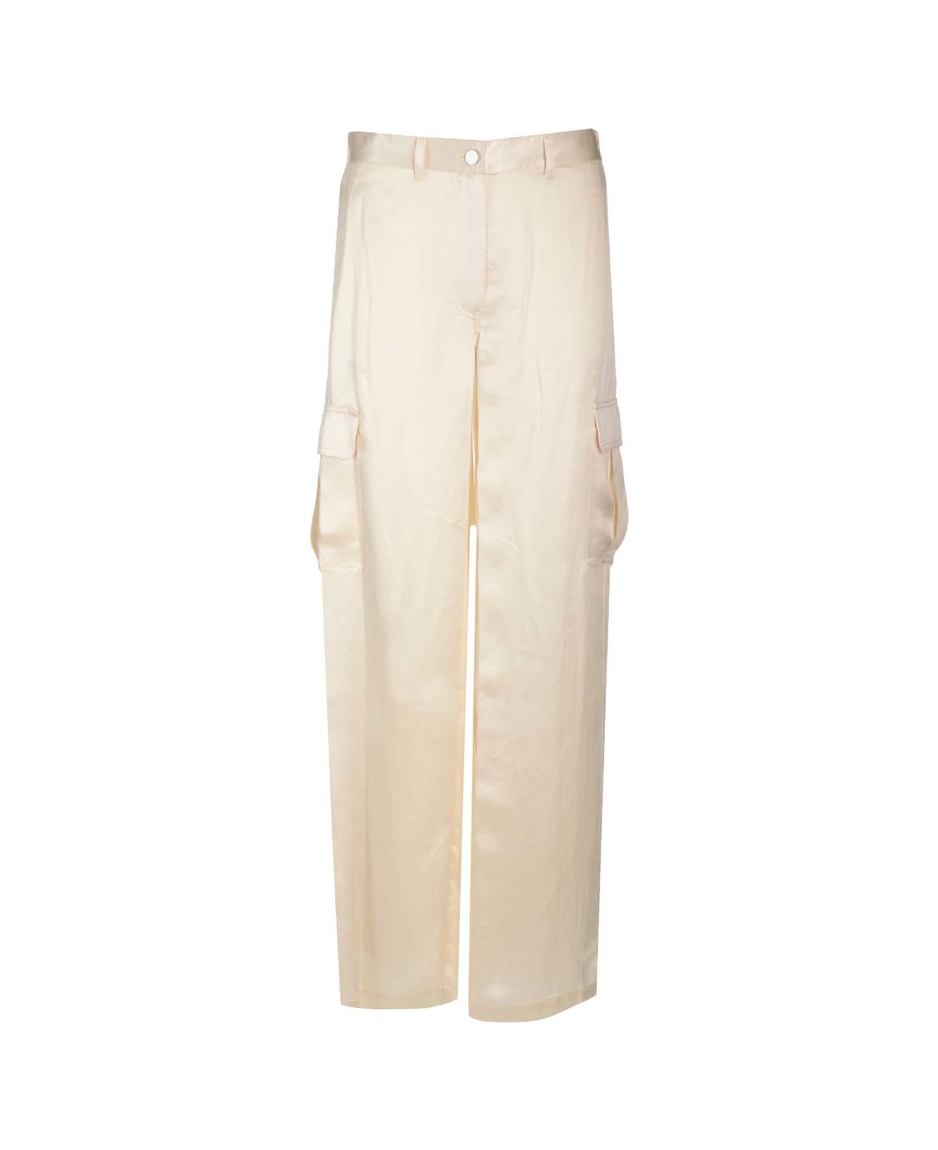 Ivory satin cargo pant from Theory. Straight leg.