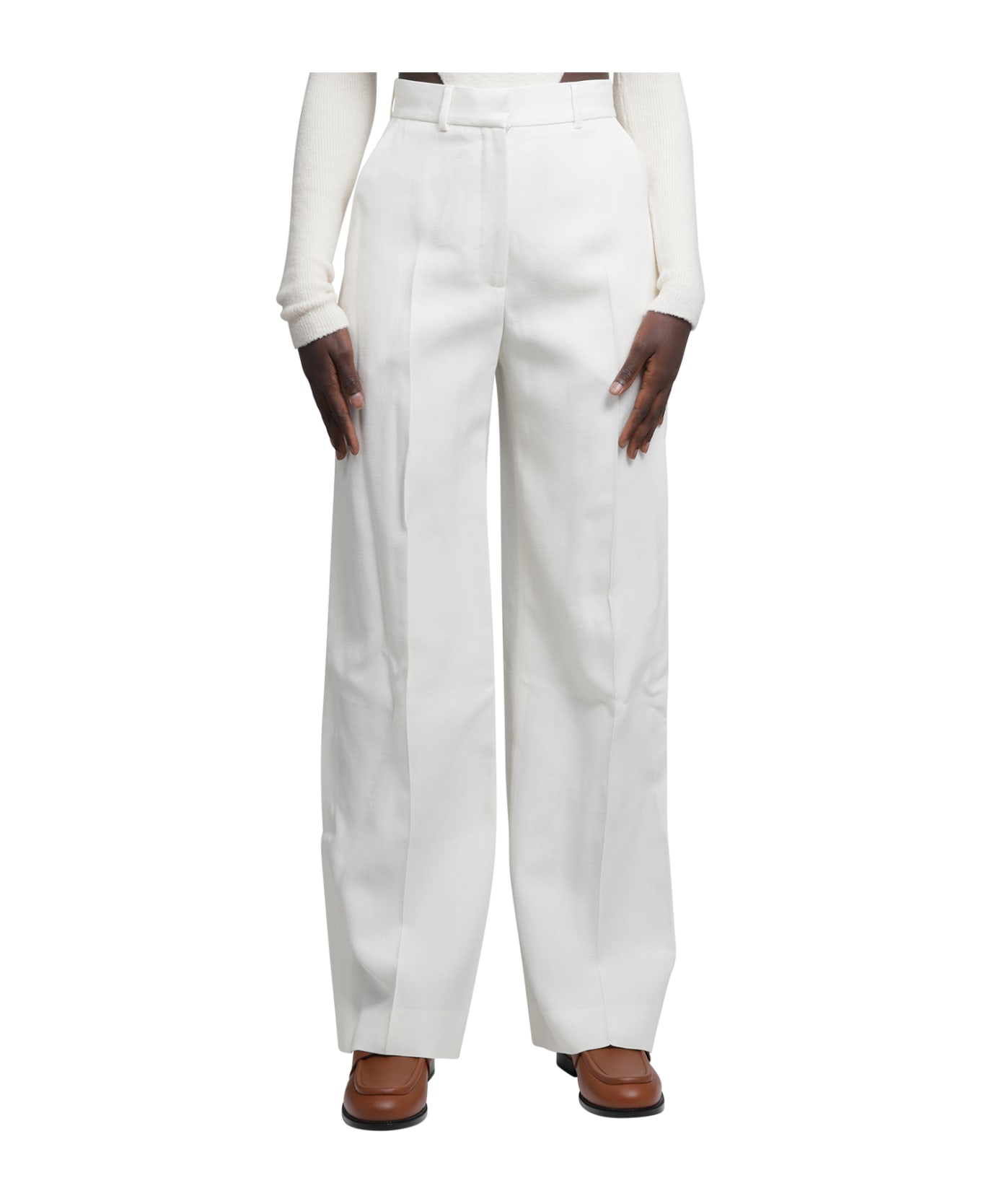 White silk blend trousers. Frontal hook and zip fastening. Two side pockets and two back patch pockets. Belt loops. Fully lined. Pleates pattern. The model is 181cm and wears size 36. Main: 57% viscose, 43% silk. Lining 1: 52% viscose, 48% cotton. Made in Portugal. Designer colour: OFF-WHITE