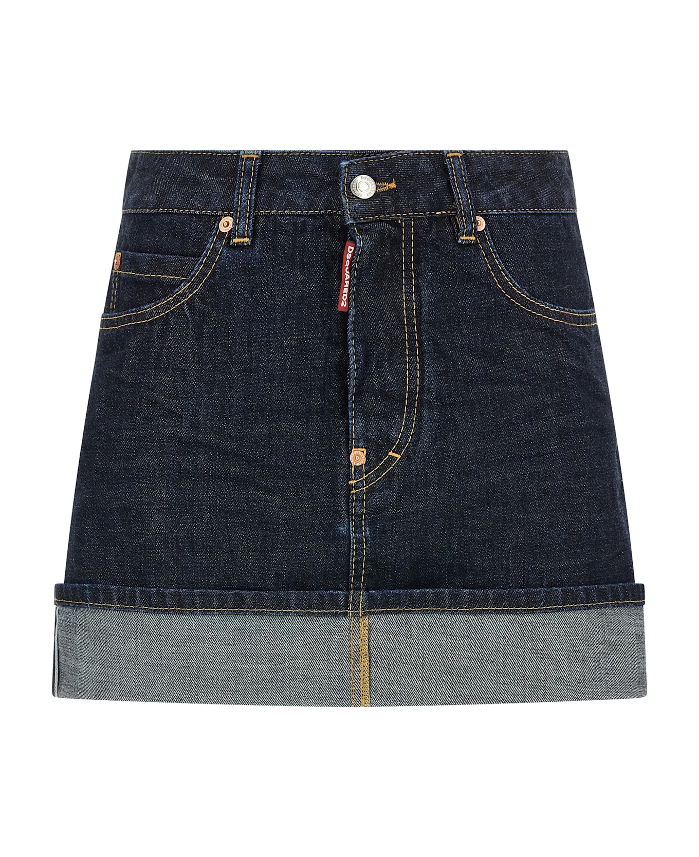 13-ounce 'Cimosa Authentic Japanese Denim' Japanese selvedge denim miniskirt, contrast stitching, front button closure, five pockets, back leather logo tag, turned-up hem.