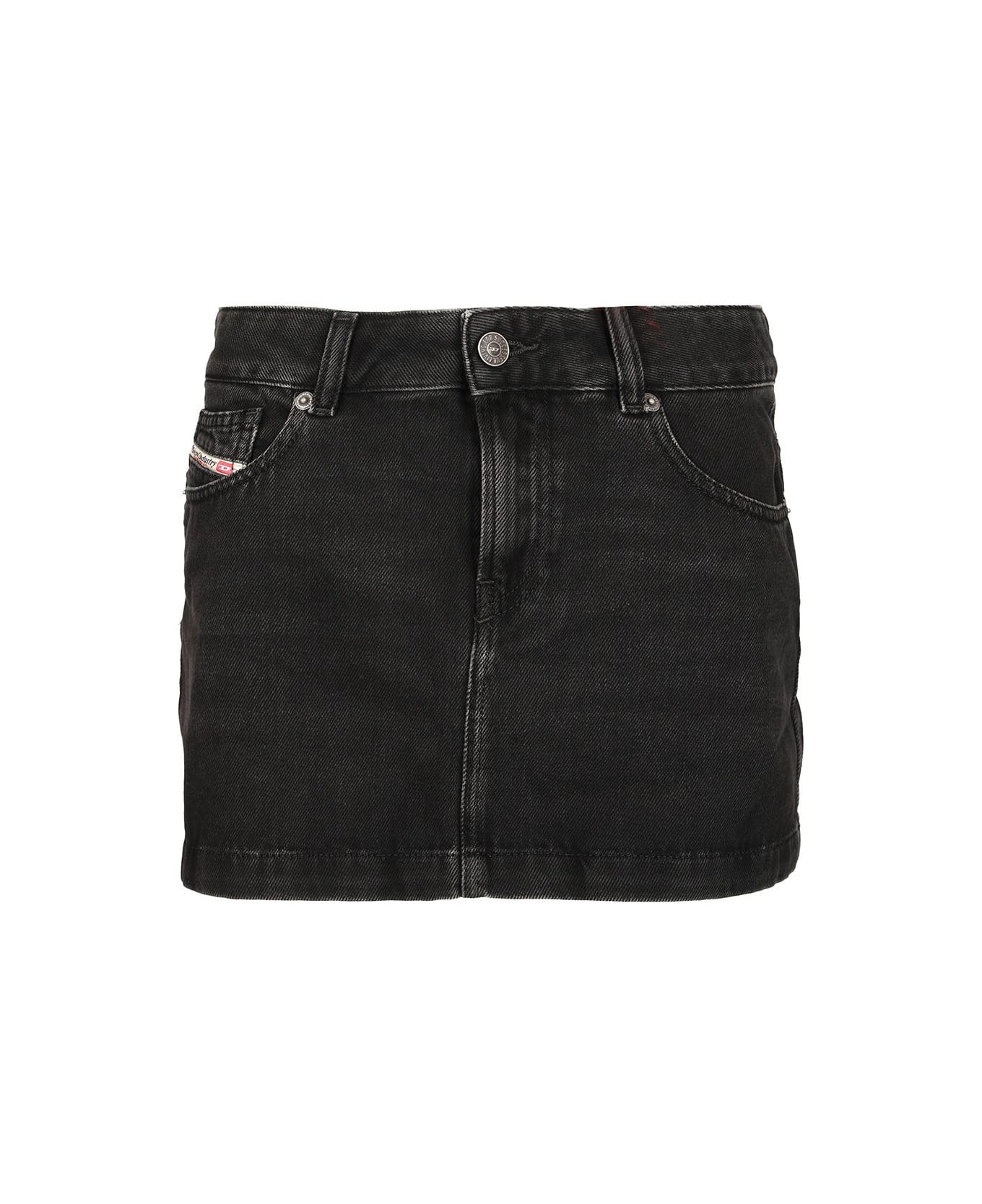 Diesel "De-Ron" short denim skirt with low-waisted design, jeans pocket with Diesel logo and jacron patch on the back. Composition: 100%CO