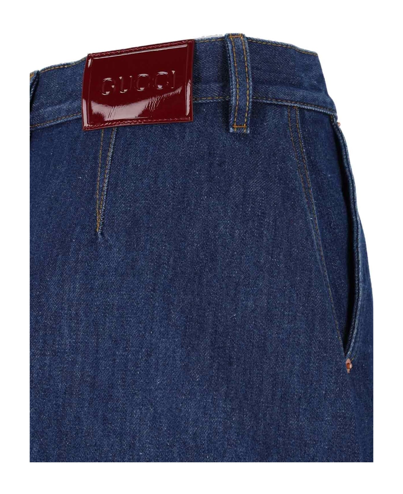 Gucci blue denim midi skirt, distressed wash, high waist, belt loops, button and zip closure, two side pockets, side pleats, back logo patch, straight hem. 100% cotton