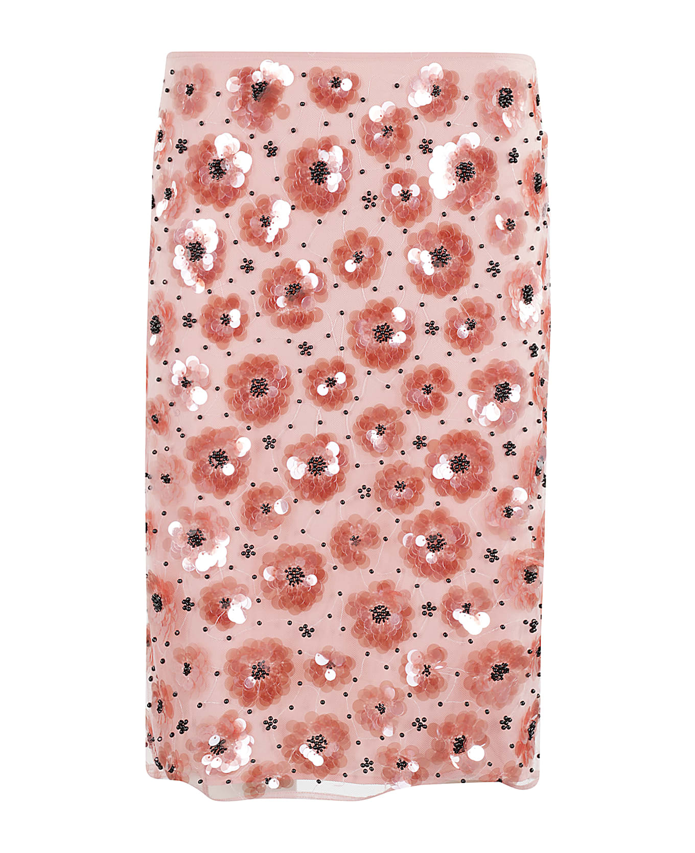 Flower Sequins Skirt - Rotate - Pink color - Mesh fabric with floral sequin embellishments - Mid-waist - Straight line - Side zipper closure - Knee length - Regular fit.