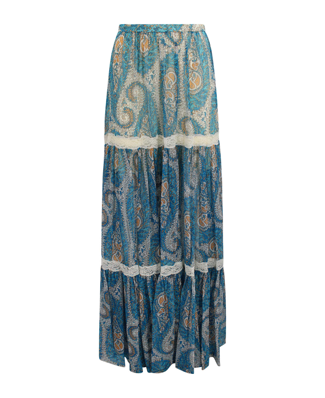 Long skirt crafted in lightweight fabric featuring a paisley print and lace trim. Finished with an elasticated waist for comfortable fit. Features Color: blue with paisley print Lace trim Elasticated waist Origin: Italy Composition: 100% Silk