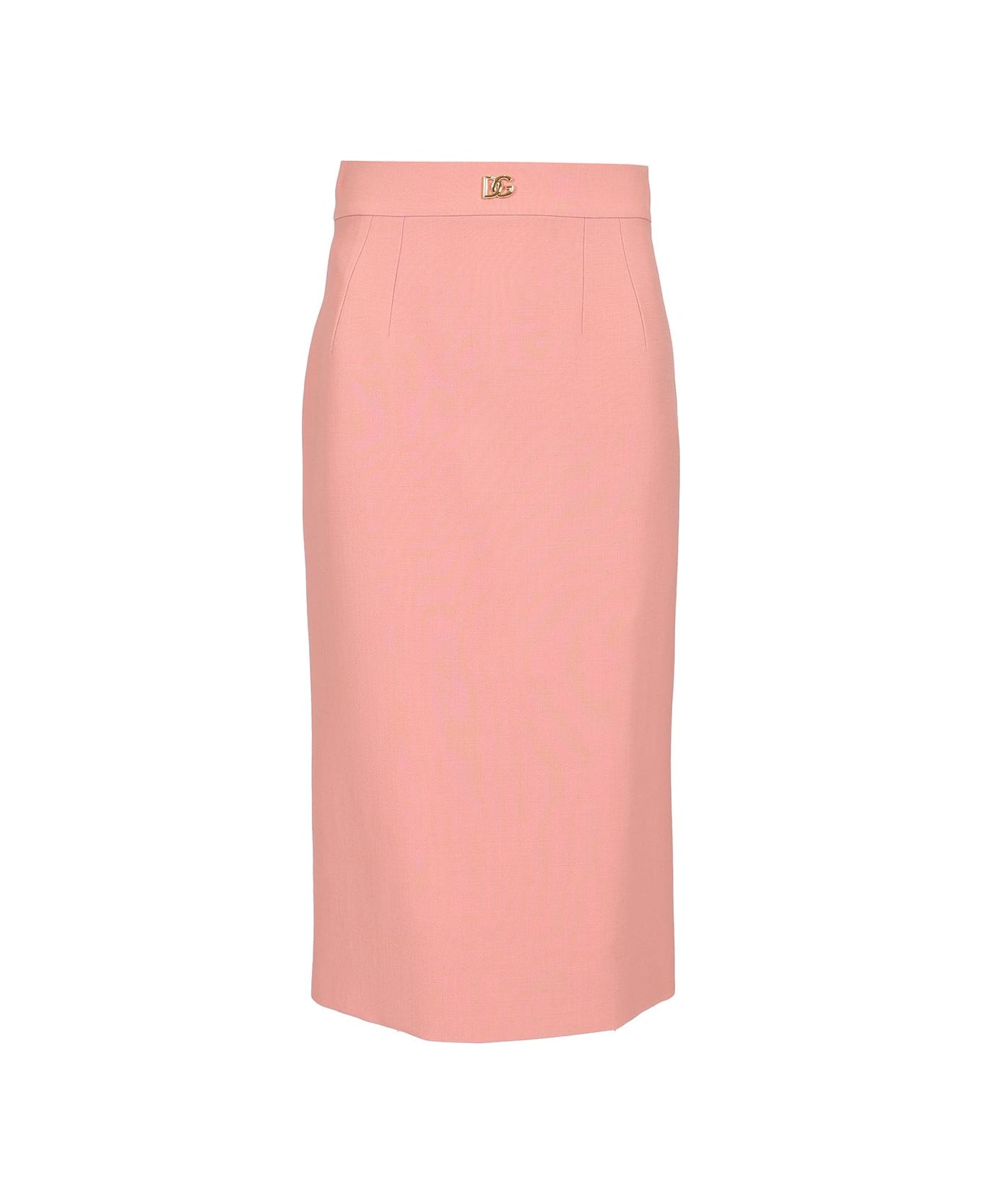 Midi pencil skirt from Dolce & Gabbana in pink double wool crêpe with DG logo on the strap, high waist, lined in matching stretch silk satin, rear zip and hook closure. Composition: 100% Lana Vergine