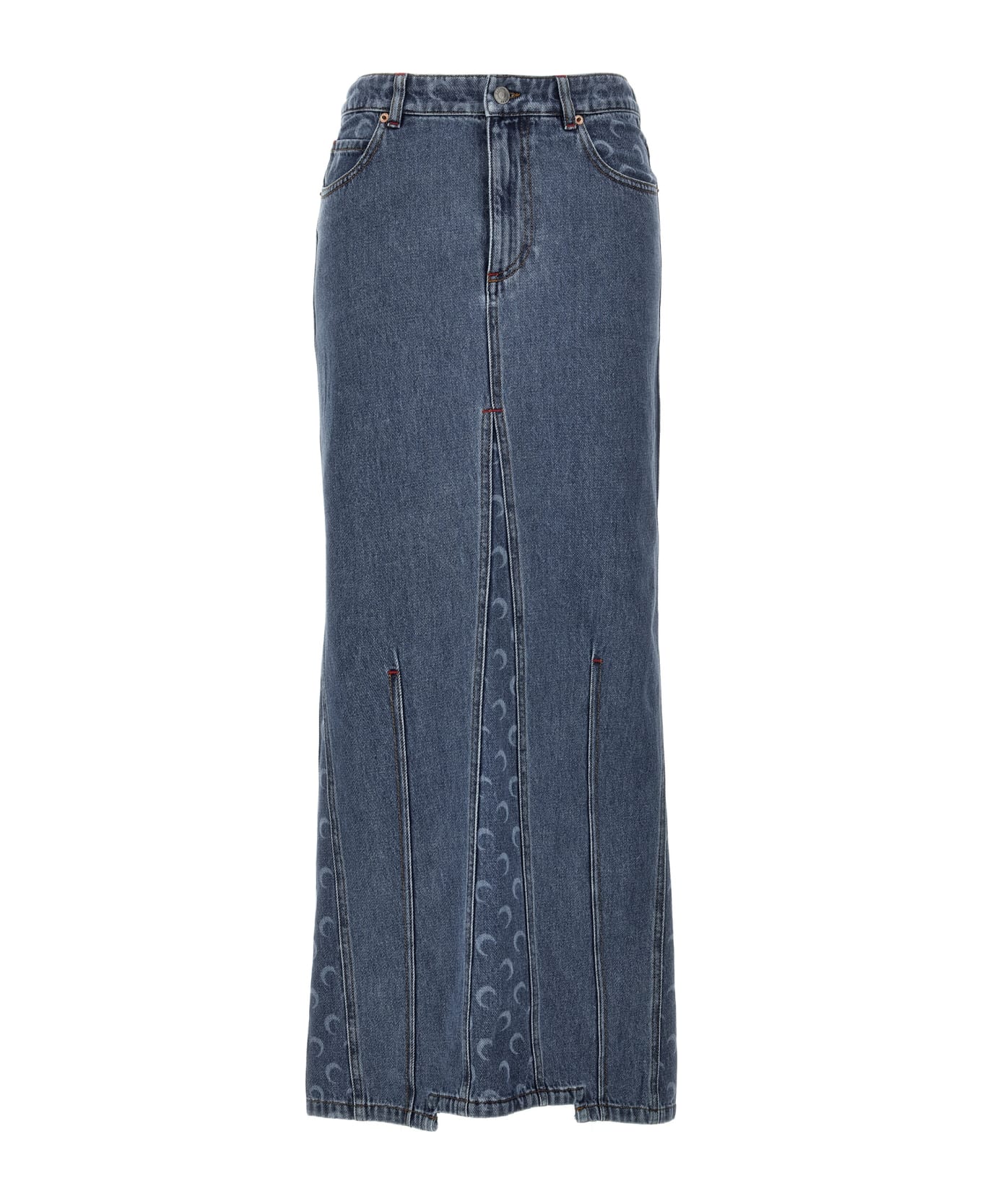 'Moon Laser' cotton denim skirt with logo print inserts, zip and button closure, five pockets, leather logo label at the back, back split.