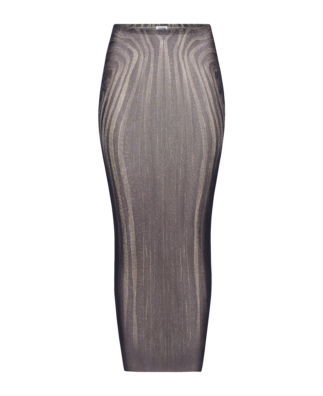 Long skirt in spiral printed mesh by JEAN PAUL GAULTIER in black with a transparent design and a fitted silhouette.