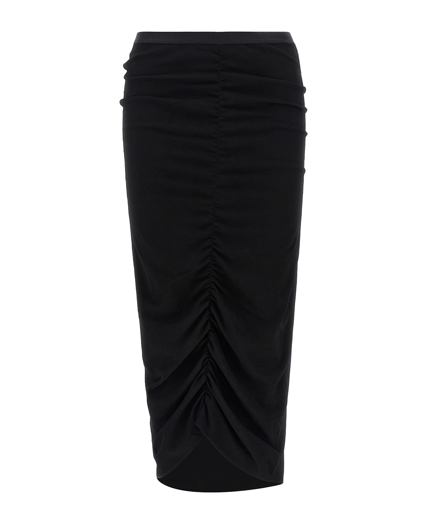 Midi skirt in stretch viscose knit, front curls and drapes, longuette model, elastic waistband, asymmetrical hem. Composition: 83% viscose, 17% polyester