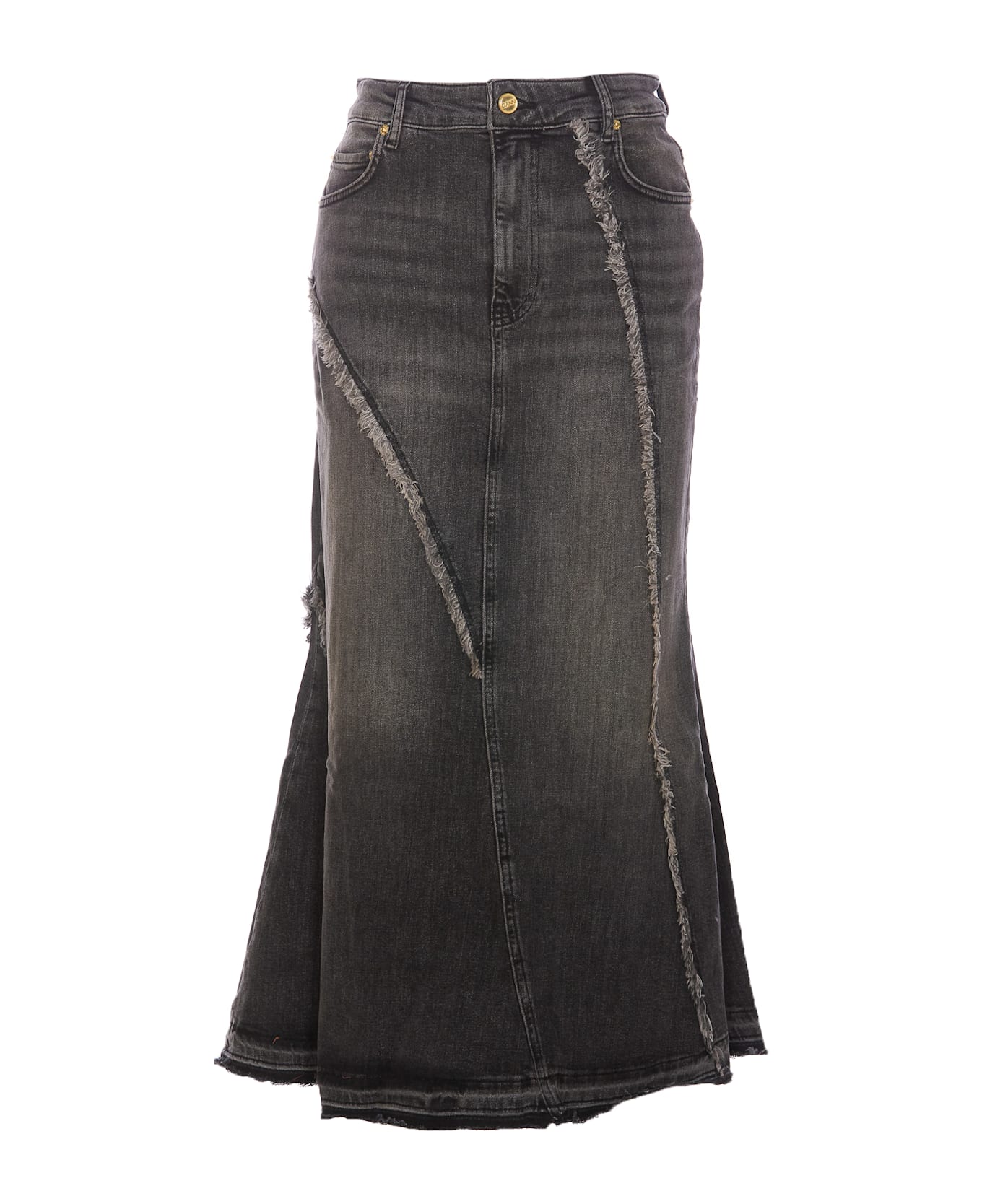 Ganni washed black denim skirt, longuette model, zip and button closure, pockets, tone on tone logo on the back, flare model, frayed edge Composition: 99% Cotton, 1% Elastane