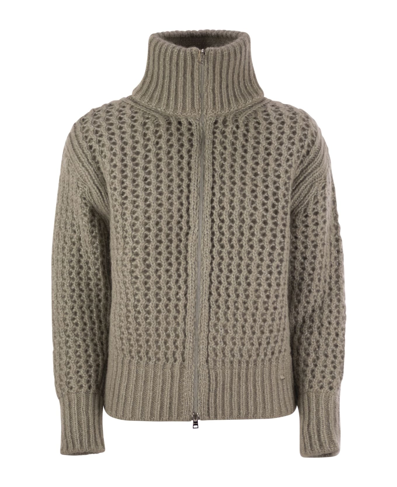 Cardigan made of alpaca and wool yarn with openwork stitch work. Easy to wear and fine in every detail, the model offers protection and a rich feel. - Regular fit - Perforated and shaved knit workmanship - Fineness 3 - High collar - Double-slider zip fastening - Metal logo on the back DESIGNER ID: MC00030DR70198 1985