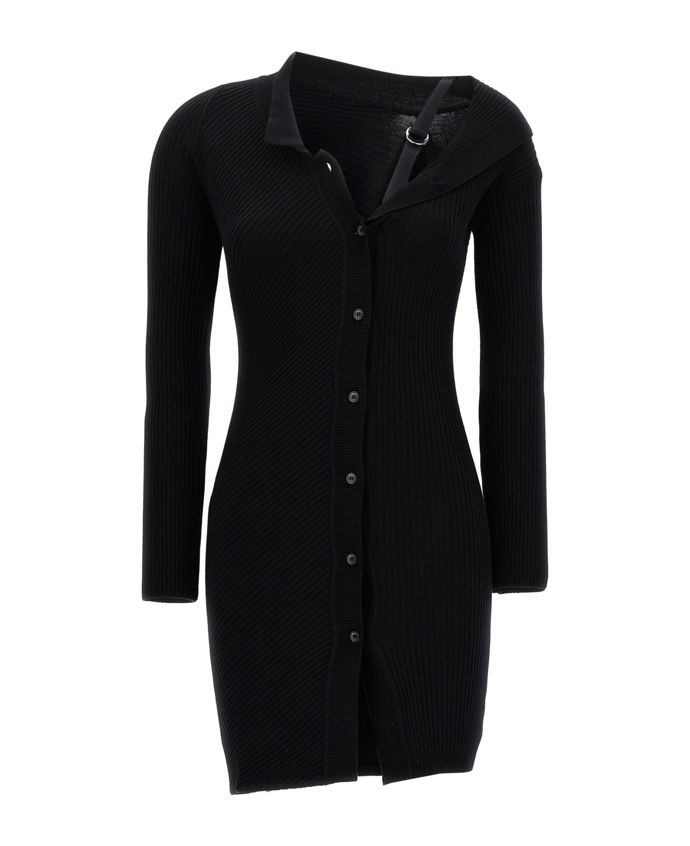 'La robe maille colin' ribbed wool blend dress with asymmetric style with front buttons, low-cut neckline with buckle detail and adjustable ribbon on the shoulder.
