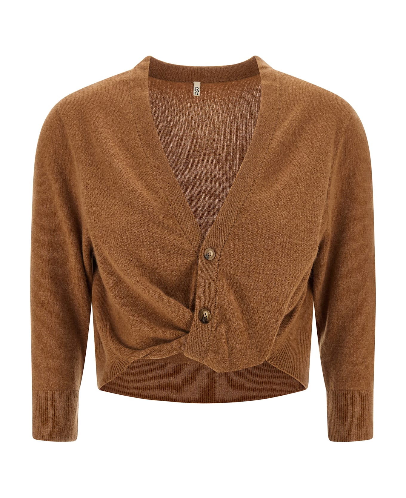 Cashmere cardigan, crop style with front twisted knot, V-neck, button closure, 3/4 sleeves. Composition: 100% cashmere
