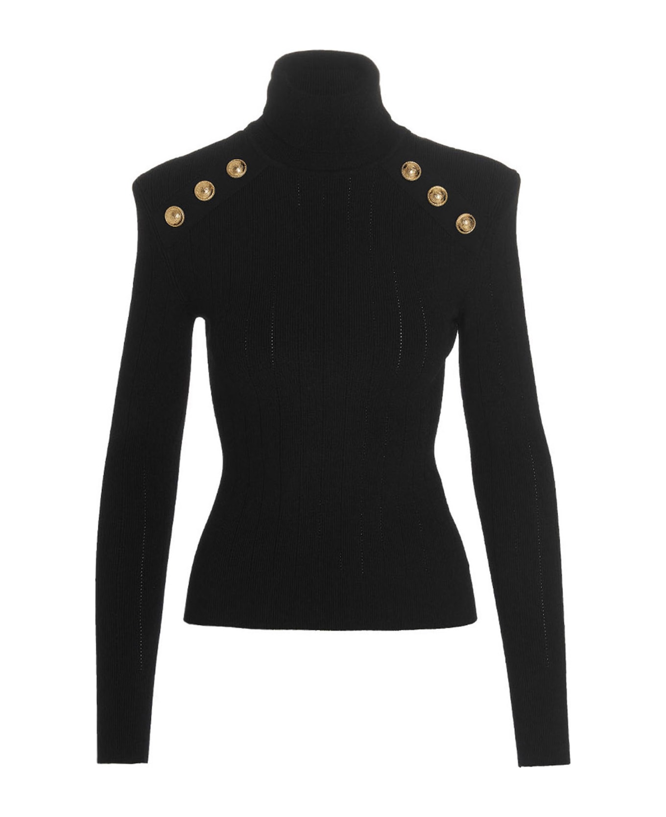 Viscose blend knit polo neck sweater featuring gold logo buttons, high neck, long sleeves and padded shoulders. : This product is made in sustainable viscose. Composition: 83% viscose 17% polyester