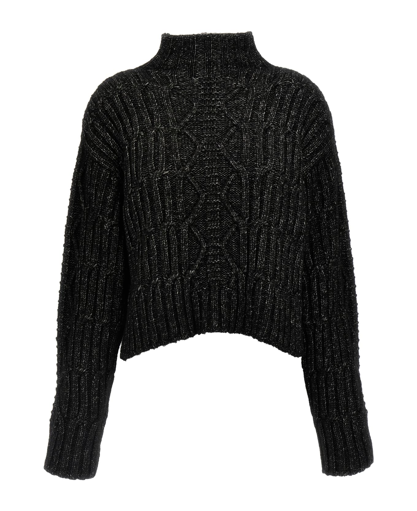 Braided cotton blend sweater with high neck, long and wide sleeves.
