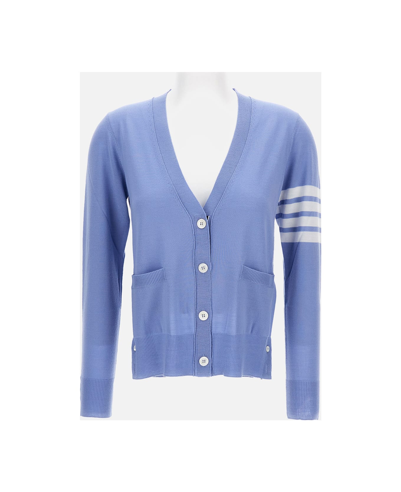 V-neck cardigan in fine merino wool. Featuring 4-Bar stripe detailing on the left sleeve. Front button closure. Side vents and cuffs with buttons and signature grosgrain trim. Rear striped grosgrain loop tab on the neck. Relaxed fit. Made in Italy. Color: Light blue. Composition: 100% Virgin Wool