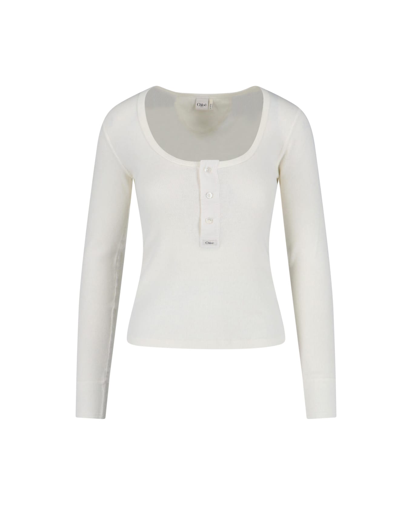 Chloé white cotton ribbed sweater with round neckline, front button closure, front logo patch, tone-on-tone embroidery detail on the back, long sleeves. Composition: 100% Cotton
