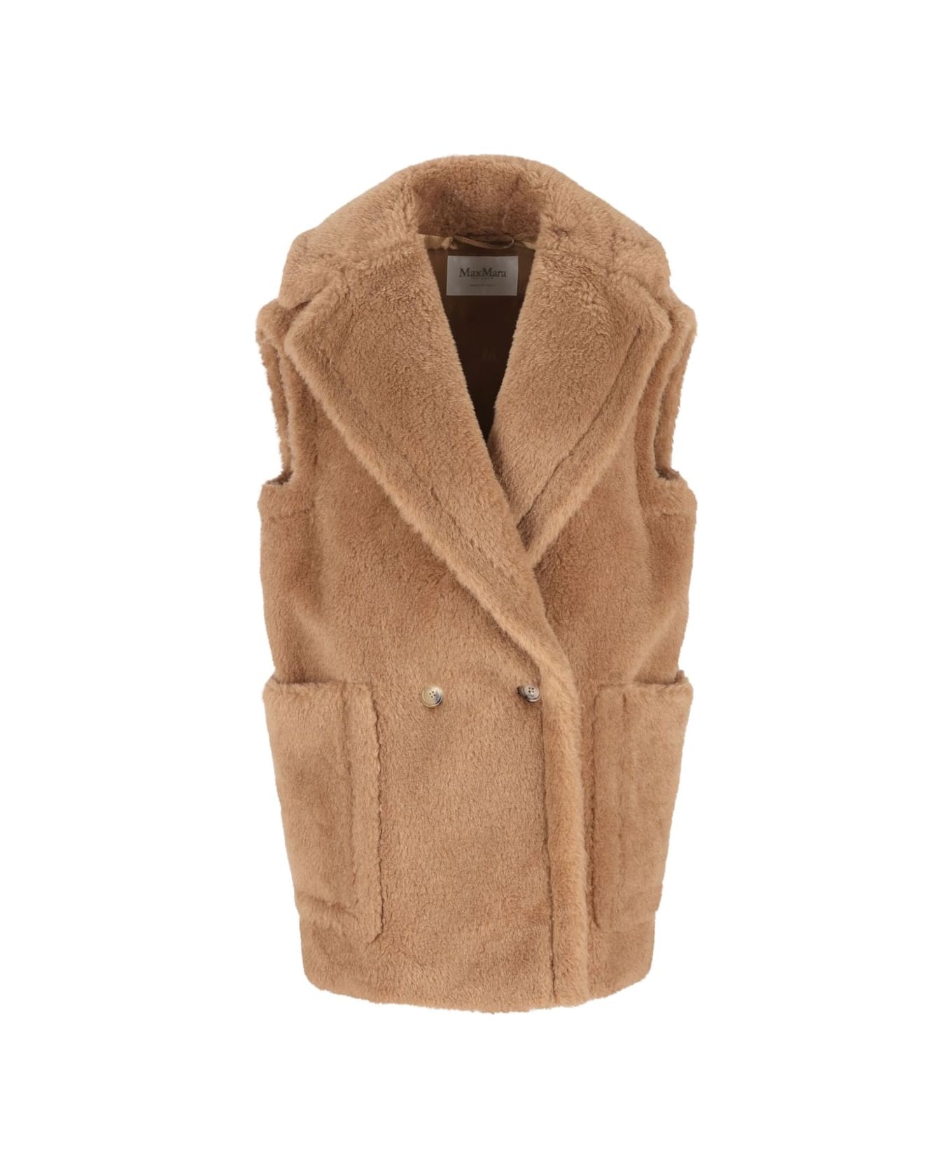brown camel wool blend double-breasted lapel collar side pockets sleeveless Composition: 88% Wool, 12% Silk