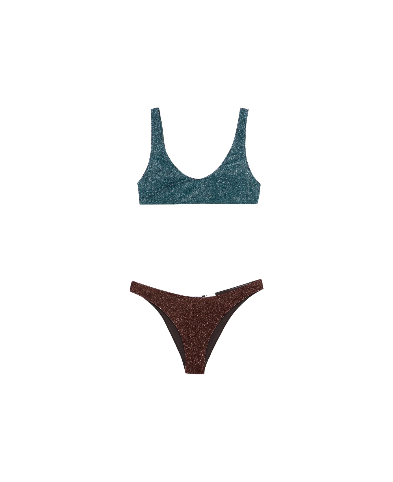peacock blue shimmer finish two-piece set brown brief Be mindful to try on swimwear over your own garments.
