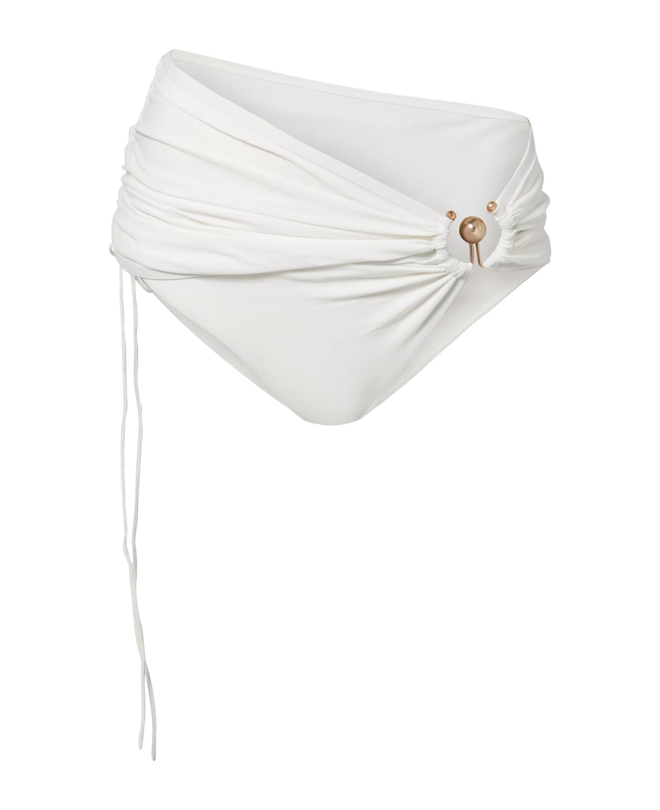 - Made of stretch Lycra - High-waisted - Overlapping gathered skirt - Size shown is XS - Color: White