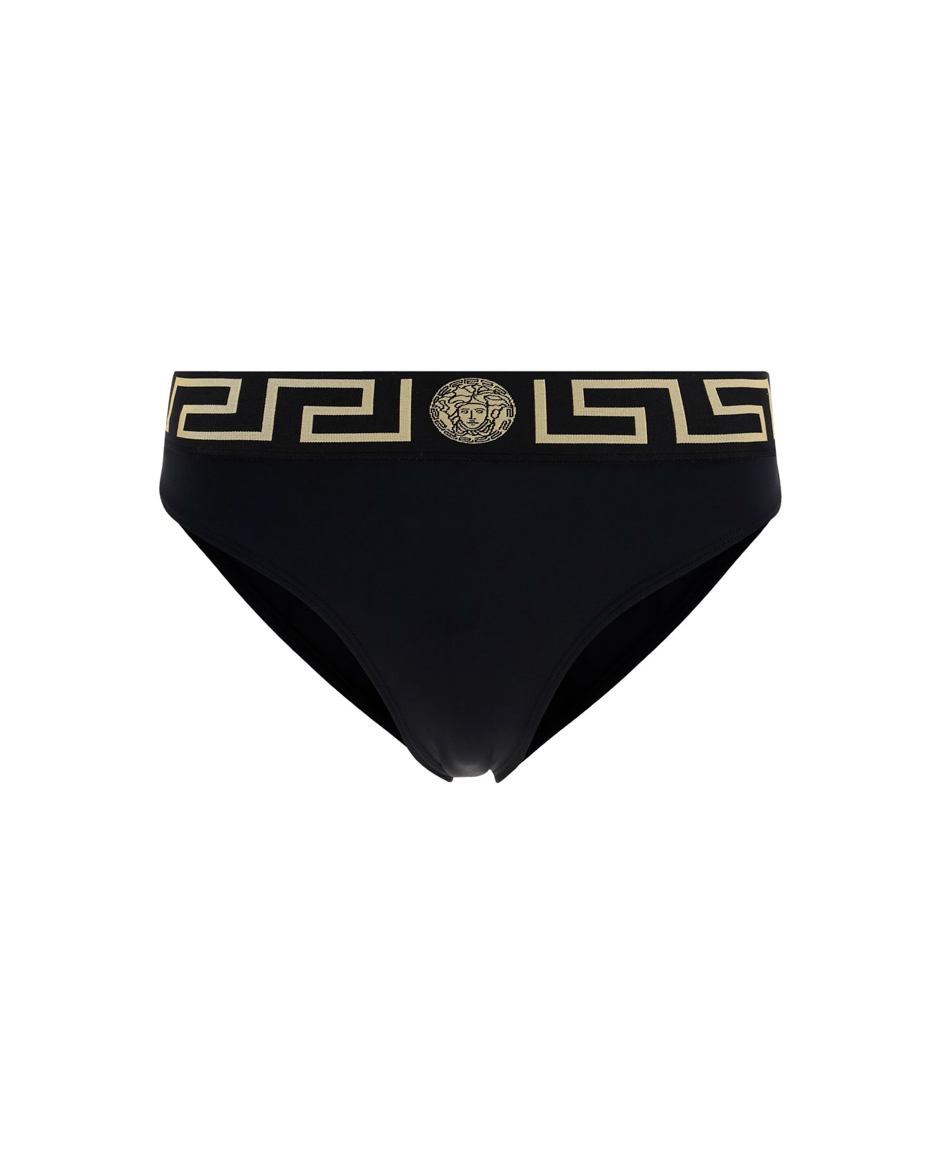 Black swimwear by versace, slip design, gold brand logo on waist, brand logo on inside label. Composition: 22% % Elastane, 78% % Nylon