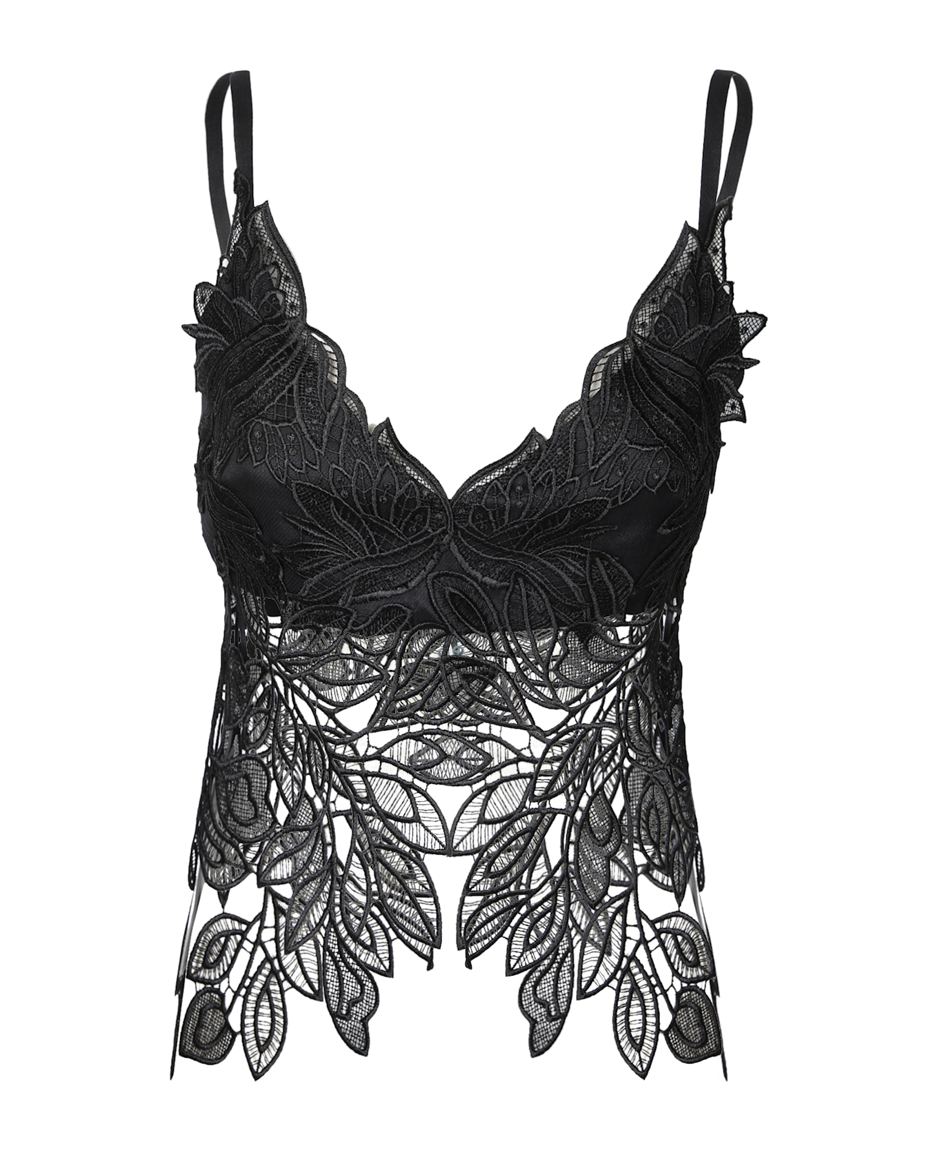 This exquisite Alberta Ferretti top is crafted in fine black macramé, adorned with an intricate leaf design that adds a sophisticated touch of nature to your wardrobe. The silhouette is enhanced with adjustable thin straps and an asymmetrical hem that pr