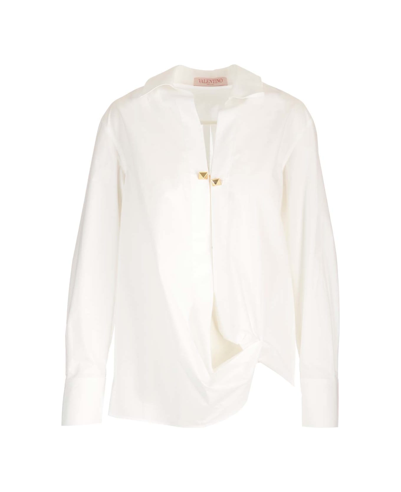 White blouse from Valentino Garavani in cotton, long sleeves, classic collar, neckline with buttons and golden studs, asymmetrical with draping. Composition: T 100%COTTON