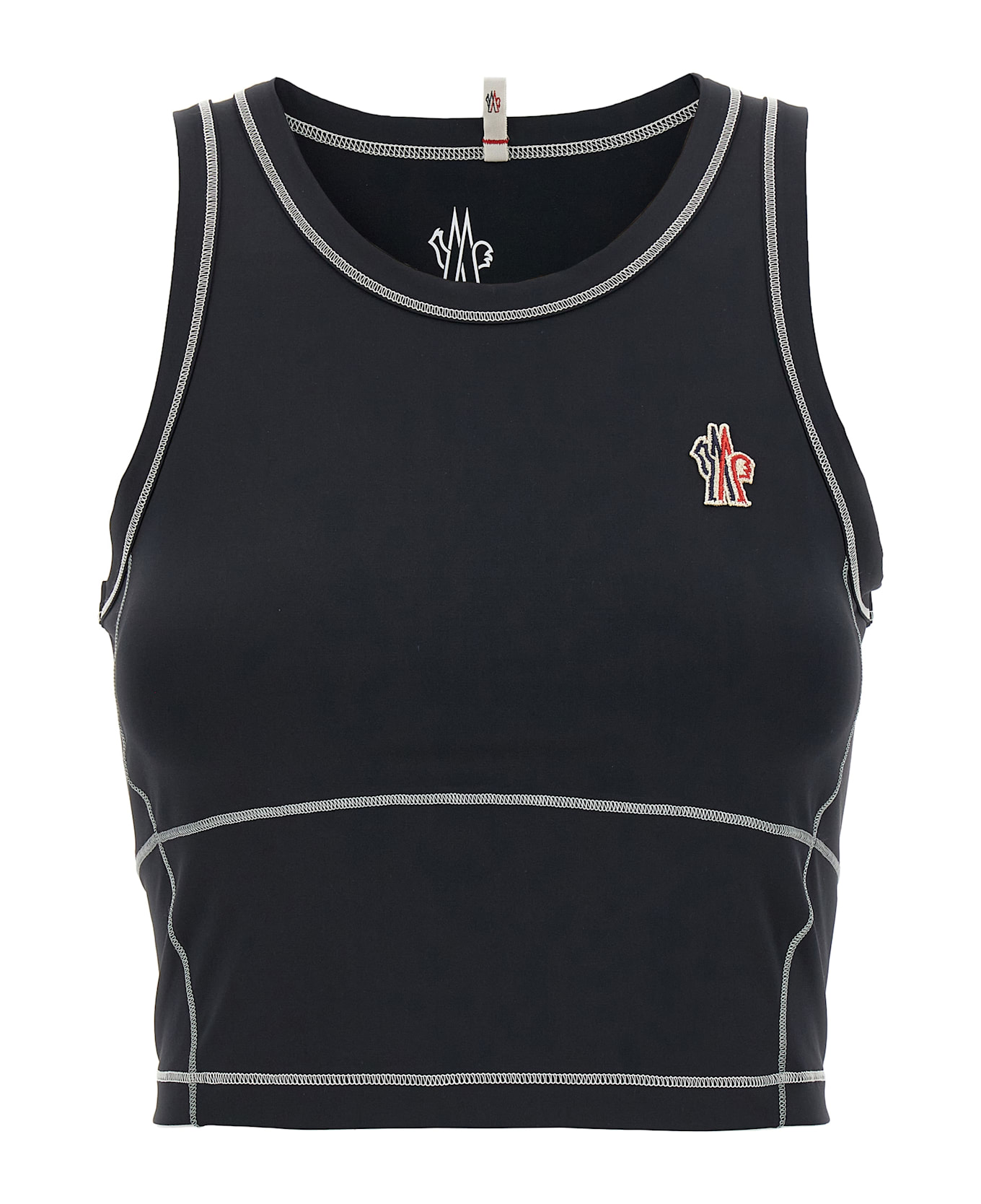 Stretch nylon blend fabric top with contrast stitching, front logo patch, crop style, crew neck.