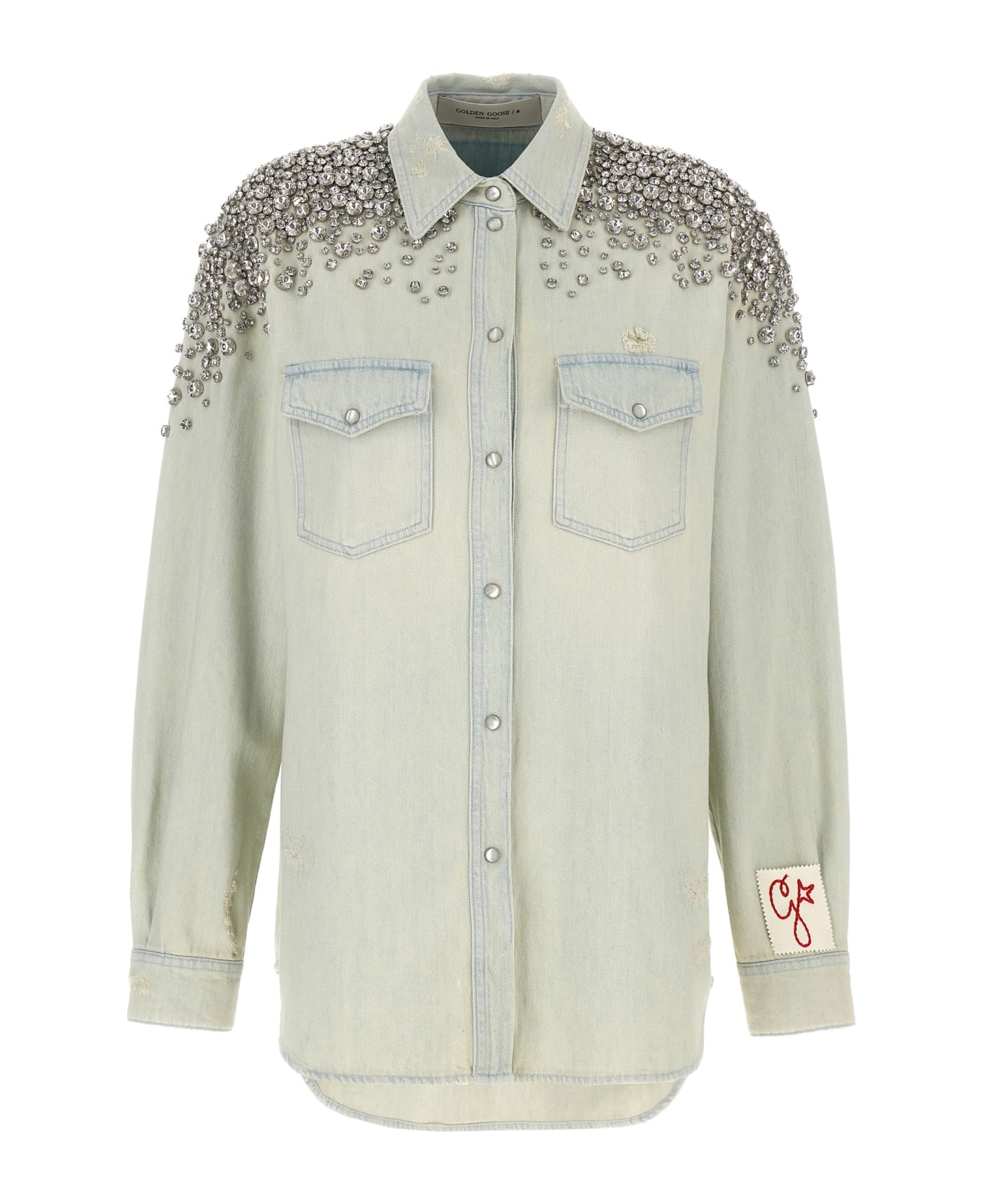 'Becca' denim boyfriend shirt, embroidered crystals, front closure with snap buttons, long cuffed sleeves.