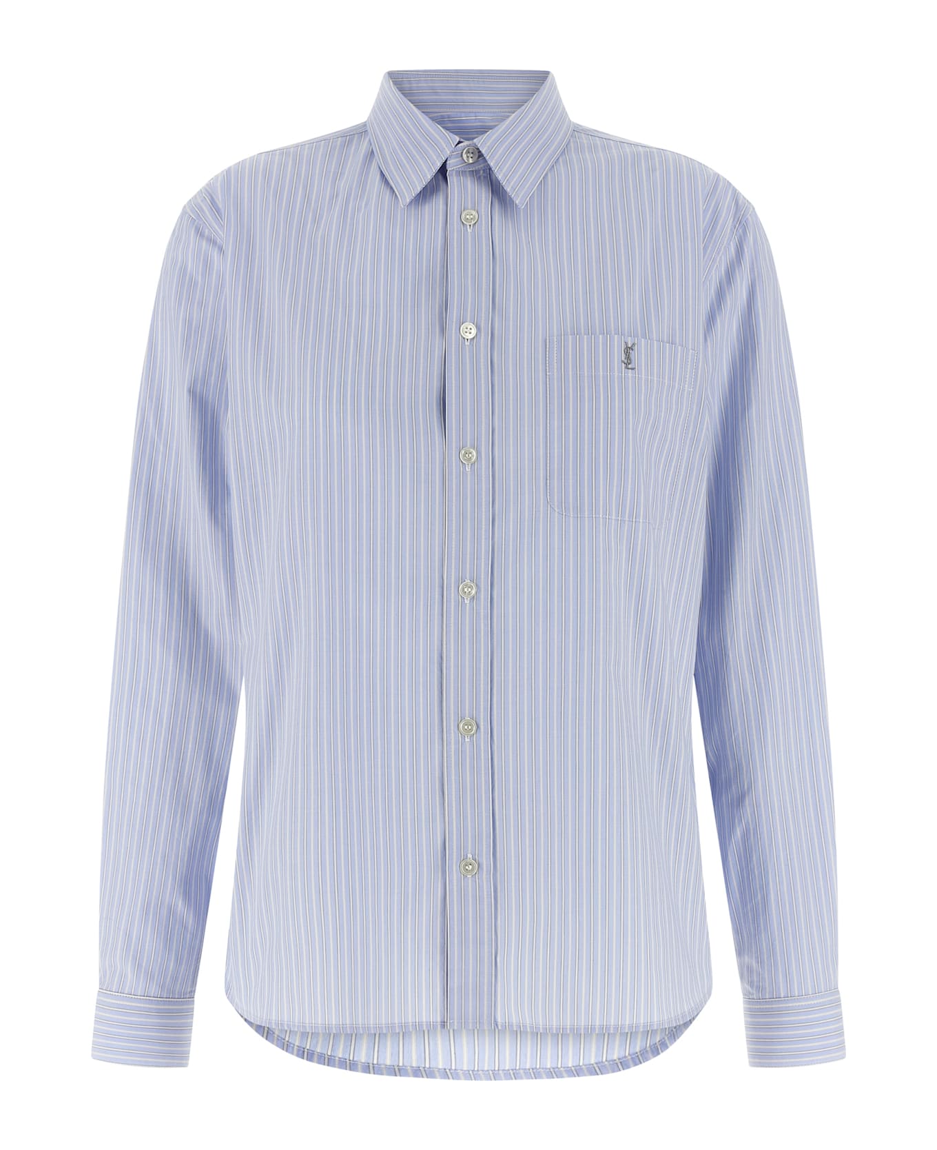 Striped cotton poplin shirt, pointed collar, breast pocket with 'Cassandre' lgoo embroidery, front mother-of-pearl button closure, long sleeves with one-button beveled cuffs, rounded hem. Composition: 100% cotton