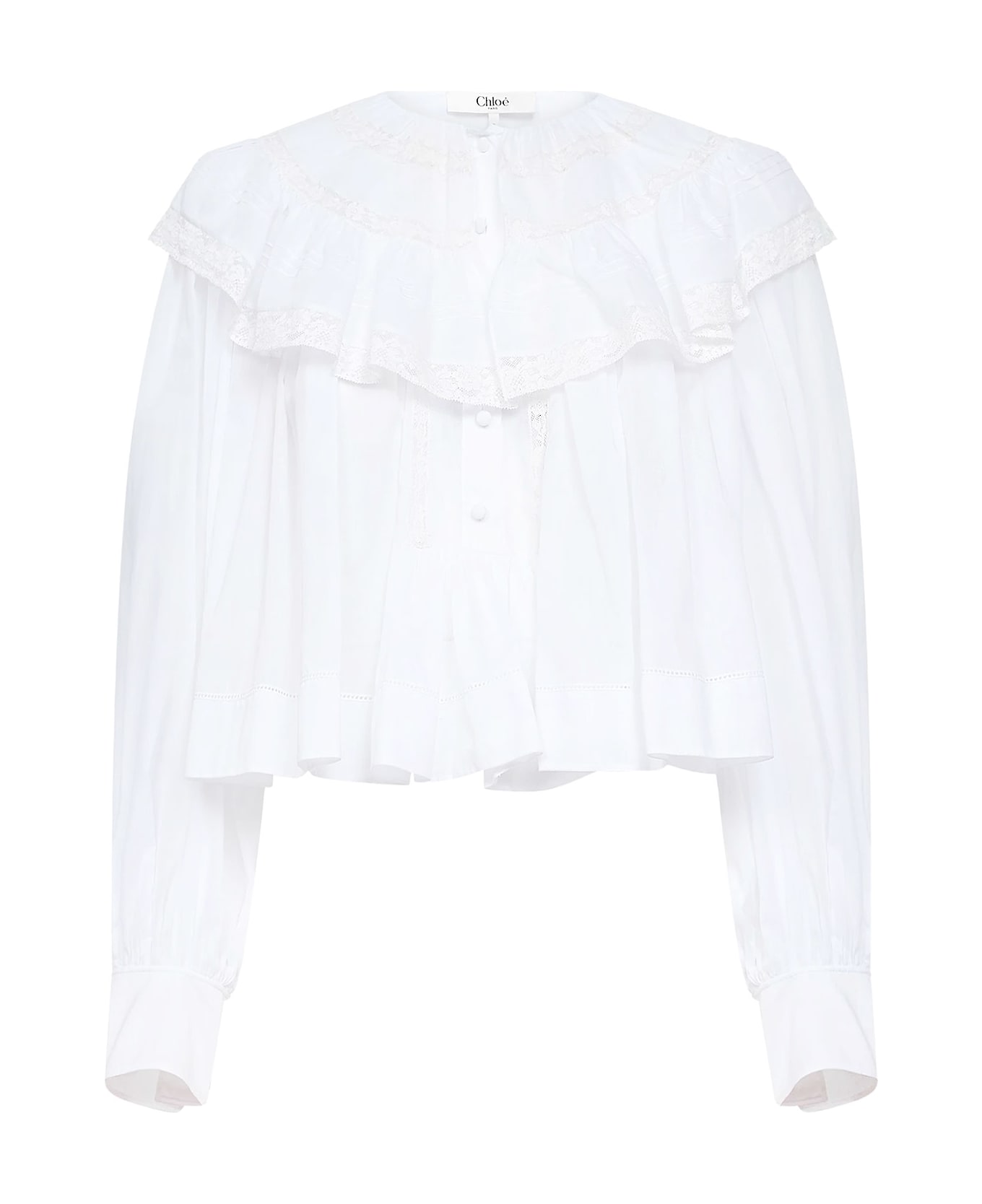 Covered button closure Crew neck with ruffles and lace inserts Long sleeves with cuffs and covered buttons Crop fit 100% cotton SKU: CH26SHT84040107