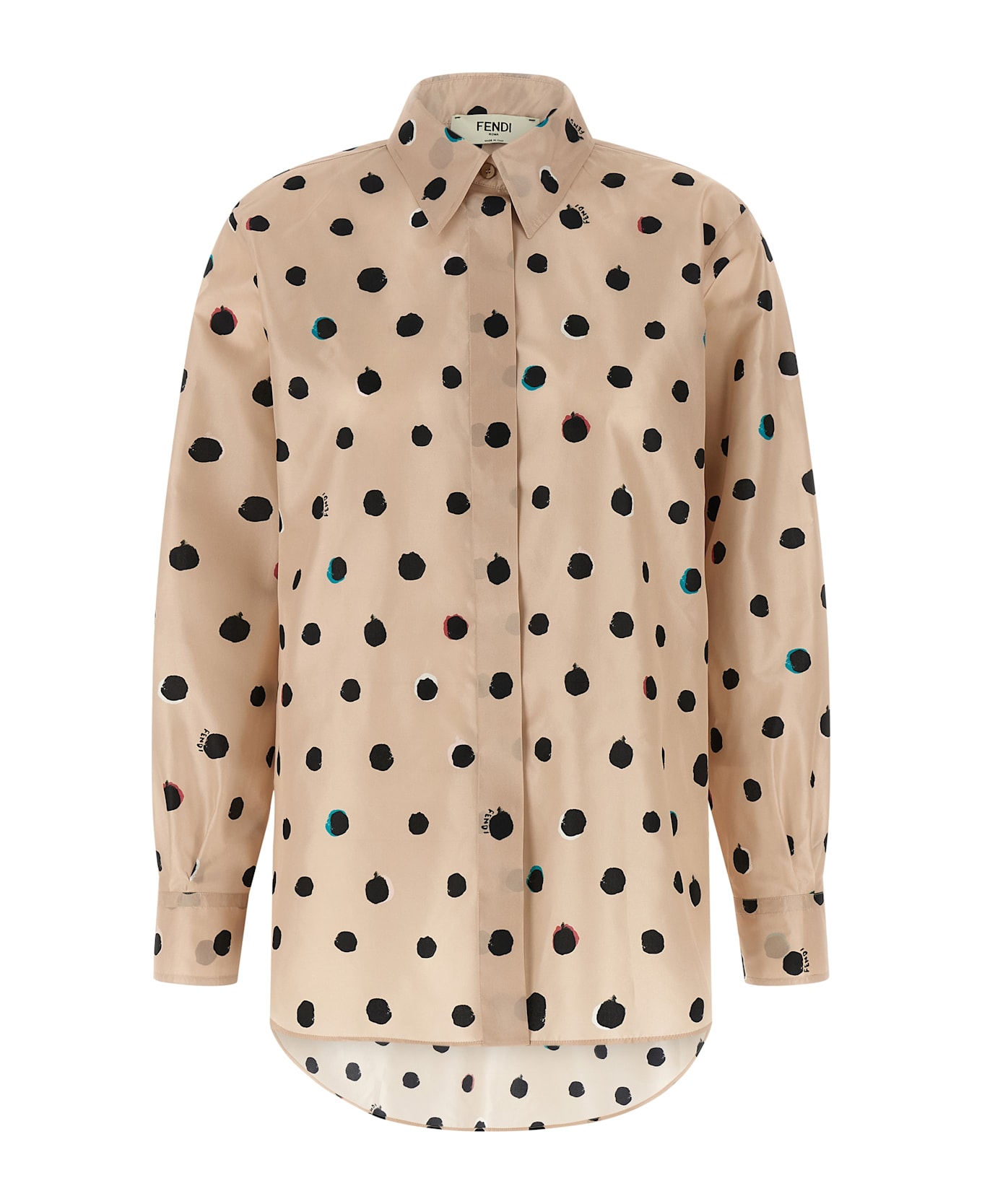 All-over 'Falena Dots' print taffeta shirt, concealed front button closure, long sleeves with cuffs and dropped shoulders, side slits, rounded and asymmetrical hem. Composition: 100% silk