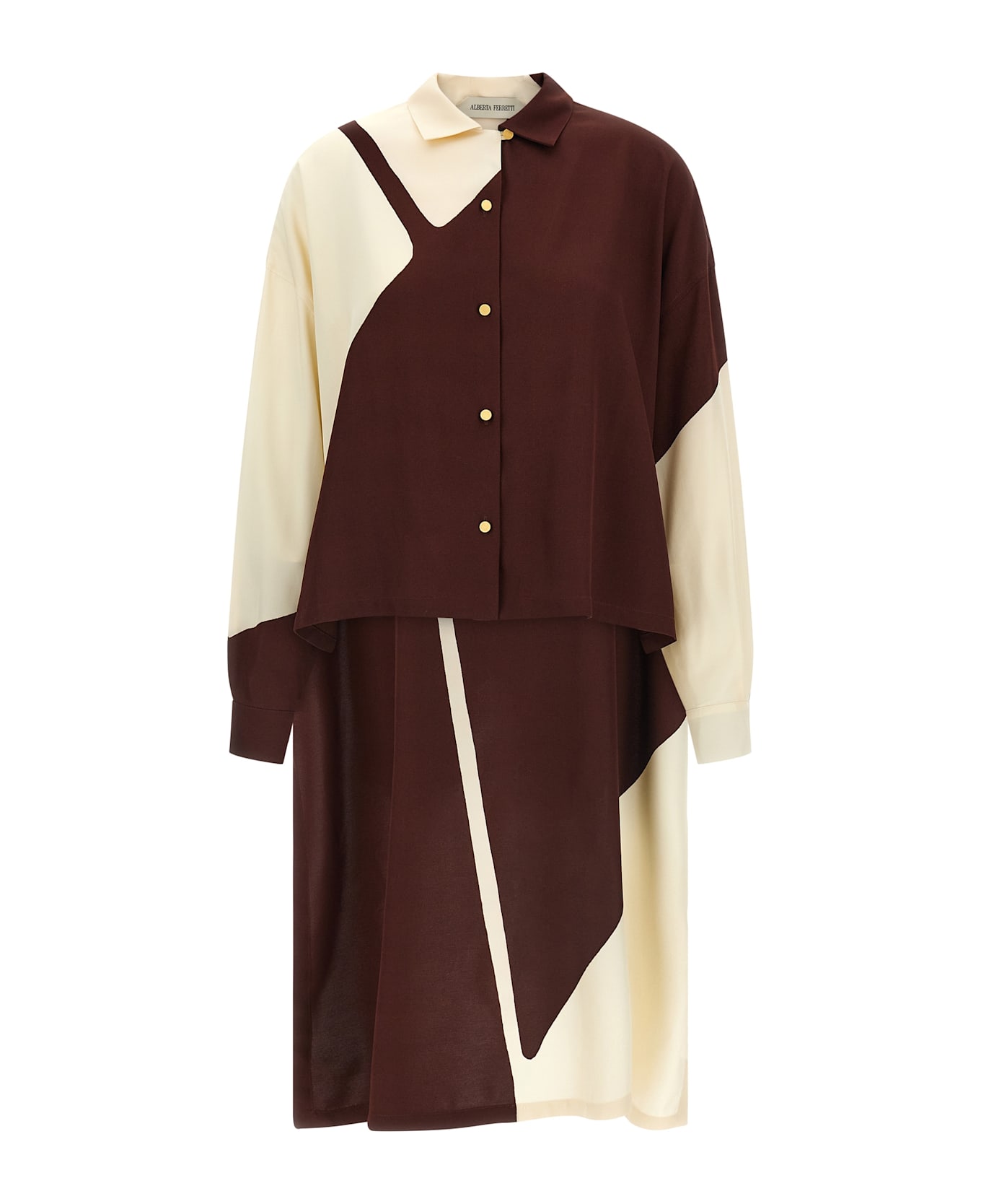 Fluid viscose shirt with graphic color block print, front metal button closure, long sleeves with cuffs and dropped shoulder, side slits on an asymmetrical hem with train.