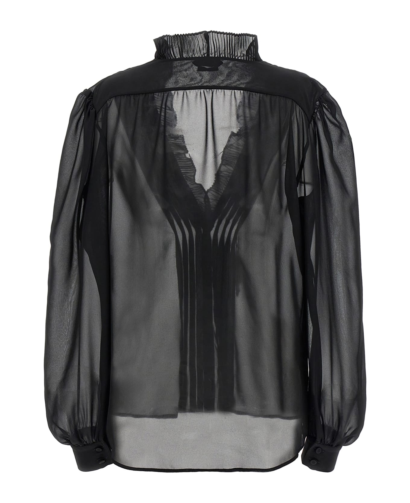Semi-transparent georgette shirt, V-neck with ruffled piping, front button closure with pleats, long cuffed sleeves. Composition: 100% polyester