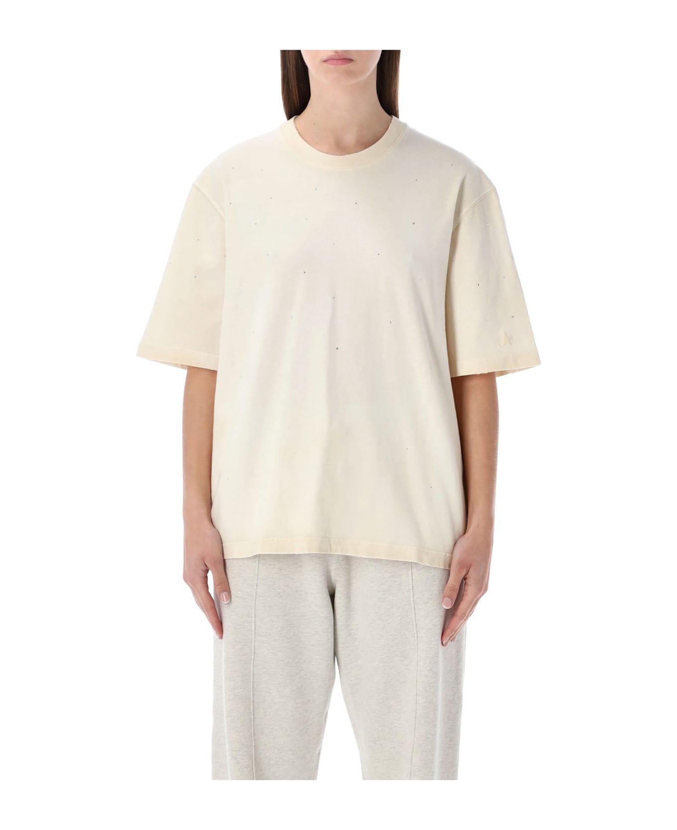 This Cotton T-shirt By Golden Goose Blends Casual Attitude With Refined Detailing. The Relaxed Silhouette Is Elevated By Subtle Crystal Embellishments Scattered Across The Surface, Adding A Discreet Luminous Effect. Finished With A Contrasting Logo Print On The Back, It Reflects The Brand s Signature Balance Between Everyday Ease And Distinctive Character. Relaxed Fit Pure Cotton Jersey All-over Crystal Embellishments Crew Neckline Short Sleeves With Star Print Back Logo Print Metal Stars At Back Neck Distressed Finishing Alessandra Is 1,75 M And Wears Size S