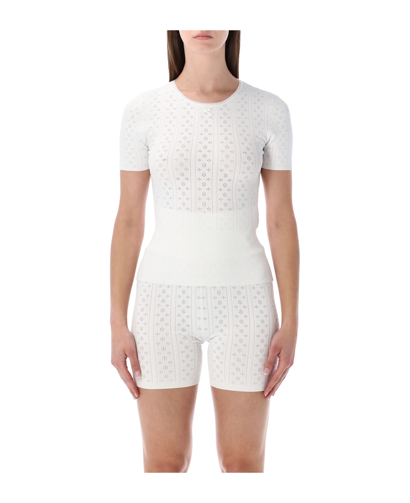 This Knitted Pointelle T-shirt By Jw Anderson Is Crafted From A Technical Stretch Viscose Knit, Offering A Refined Balance Of Comfort And Structure. The Classic Crew-neck Silhouette Is Elevated By Scalloped Detailing Along The Neckline And Finished With A Subtle Bow Accent, Adding A Feminine And Contemporary Touch To An Everyday Essential. Technical Stretch Viscose Knit Pointelle Construction Crew Neckline With Scalloped Edge Short Sleeves Bow Detail At The Neckline Fitted Silhouette Alessandra Is 1,75 M And Wears Size S